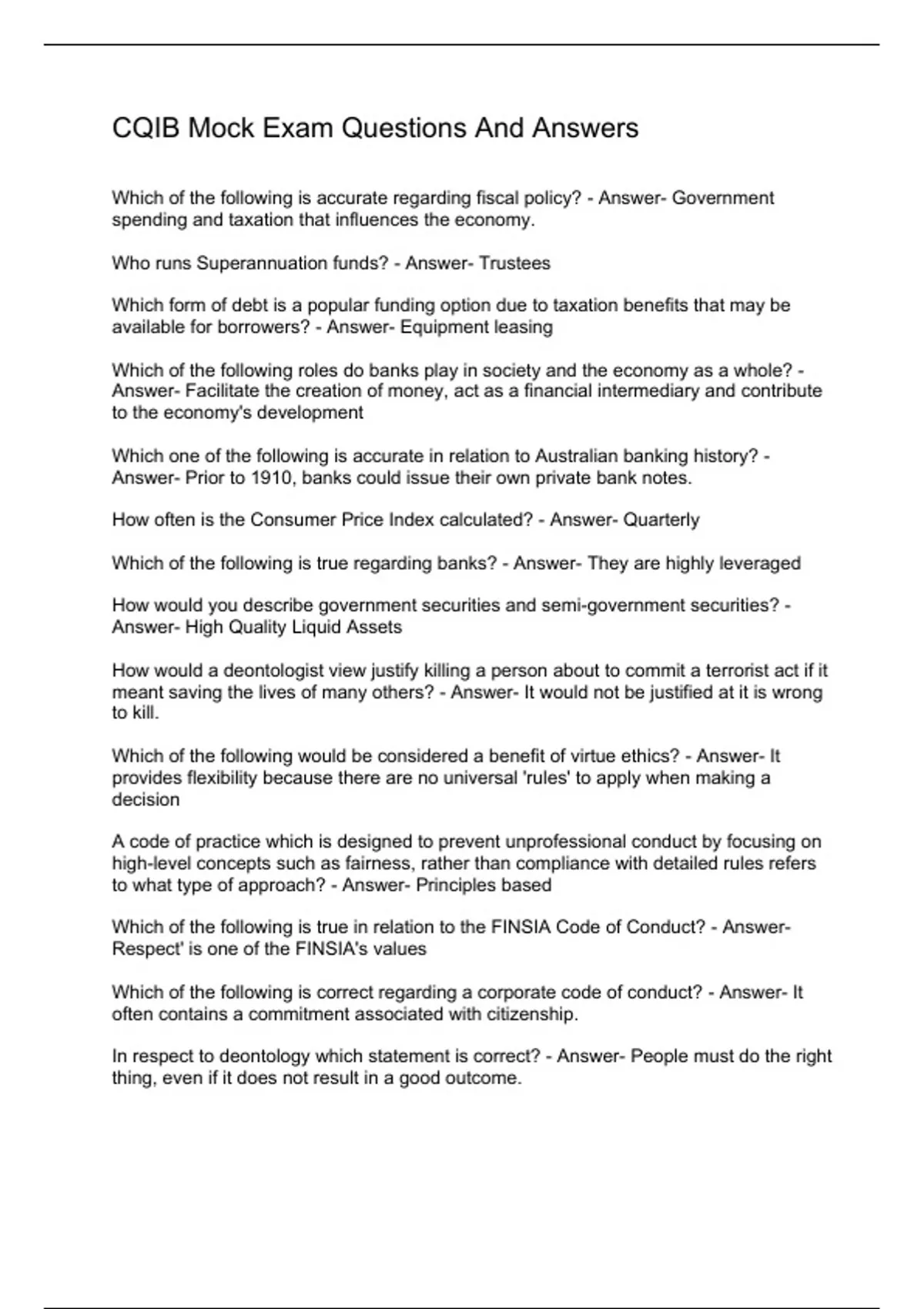 CQIB Mock Exam Questions And Answers/CQIB TEST QUESTIONS AND ANSWERS/CQIB - CHAPTER 1 - BUSINESS OF BANKING/CQIB - CHAPTER 2 - ETHICS IN BANKING/CQIB EXAM QUESTIONS AND ANSWERS 6 Exam (elaborations) CQIB EXAM QUESTIONS AND ANSWERS 7 Exam (elaborations) CQIB EXAM QUESTIONS AND ANSWERS 8 Exam (elaborations) CQIB FINAL EXAM STUDY QUESTIONS 9 Exam