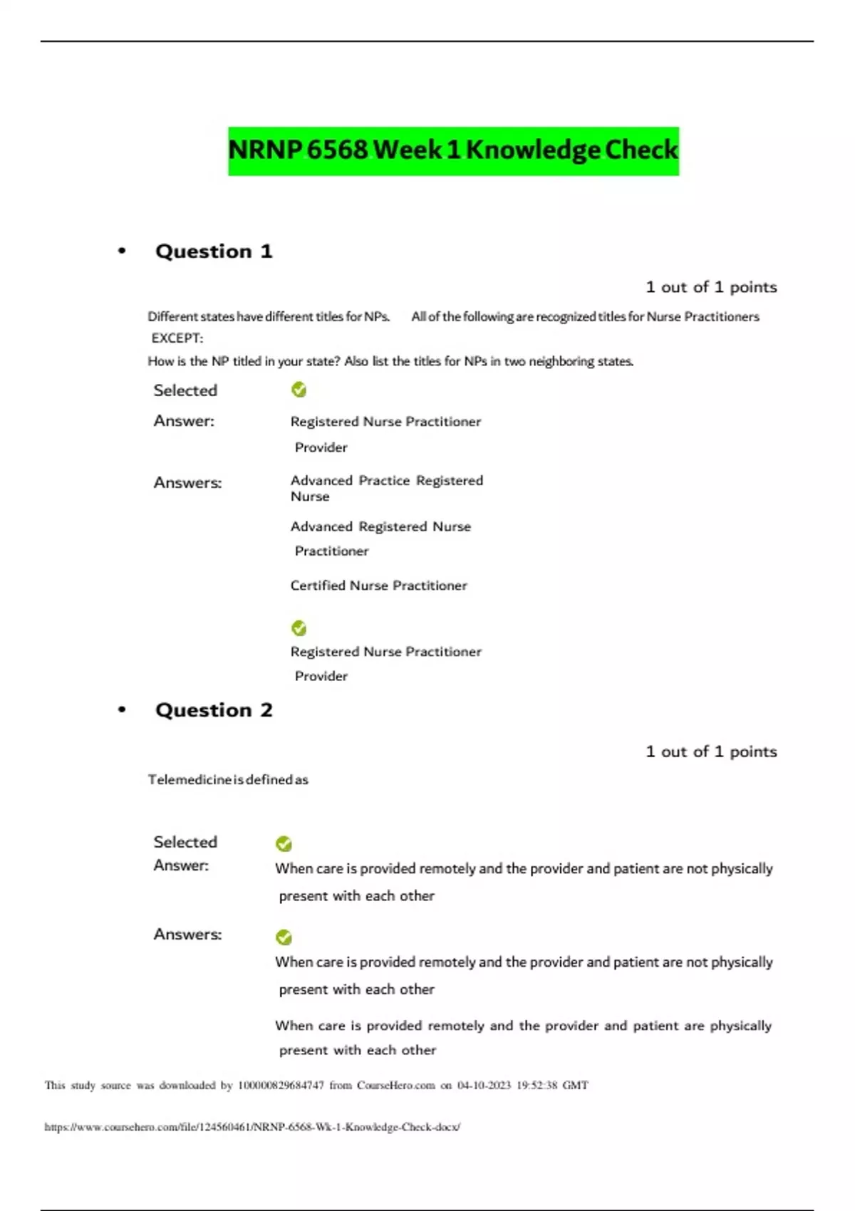 Exam (elaborations) NRNP 6568 Week 1 Knowledge Check 2 Exam (elaborations) NRNP 6568 Week 2 Knowledge Check 3 Exam (elaborations) NRNP 6568 week 3 knowledge check Newest Rated A+ 4 Exam (elaborations) • NRNP 6568 Week 7 Knowledge Check Question 1 5 Exam (elaborations) NRNP 6568 Week 5 comprehensive Review With complete solution Newest 6 Exam (
