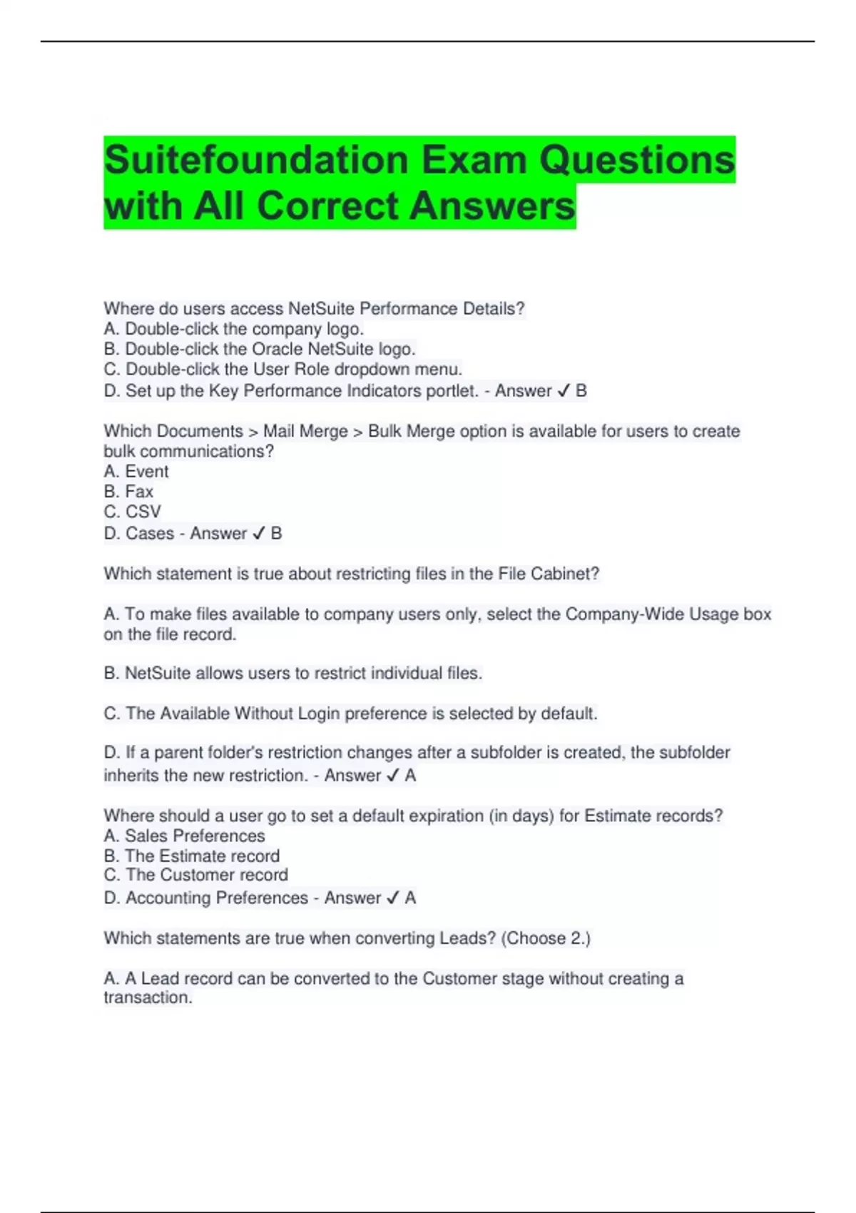 Netsuite Suitefoundation Study Cards 2024/2025 Latest Questions and Revised Answers 100% Correct 2 Exam (elaborations) NetSuite SuiteFoundations Exam Questions with 100% Correct Answers 3 Exam (elaborations) NetSuite SuiteFoundations Exam Prep Questions with 100% Correct Answers 4 Exam (elaborations) Suitefoundation Exam Questions with All Corre