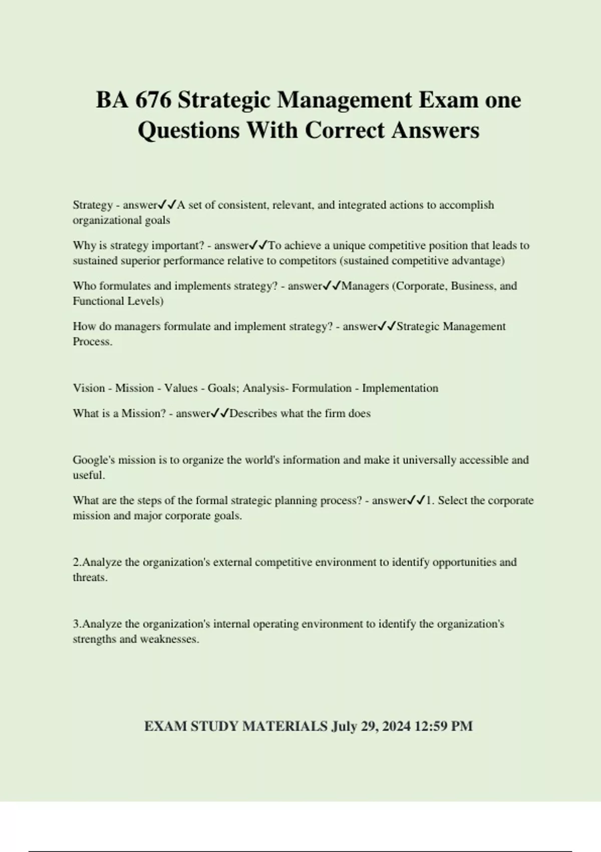 BA 676 Strategic Management Exam one Questions With Correct Answers