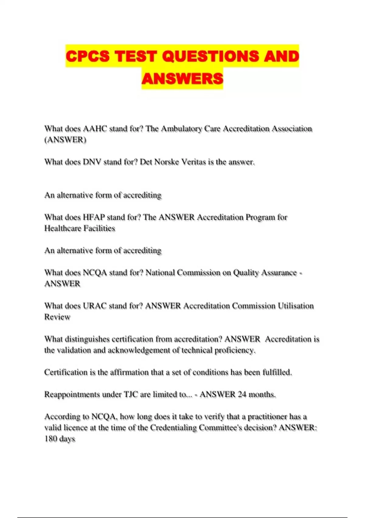 CPCS TEST QUESTIONS AND ANSWERS