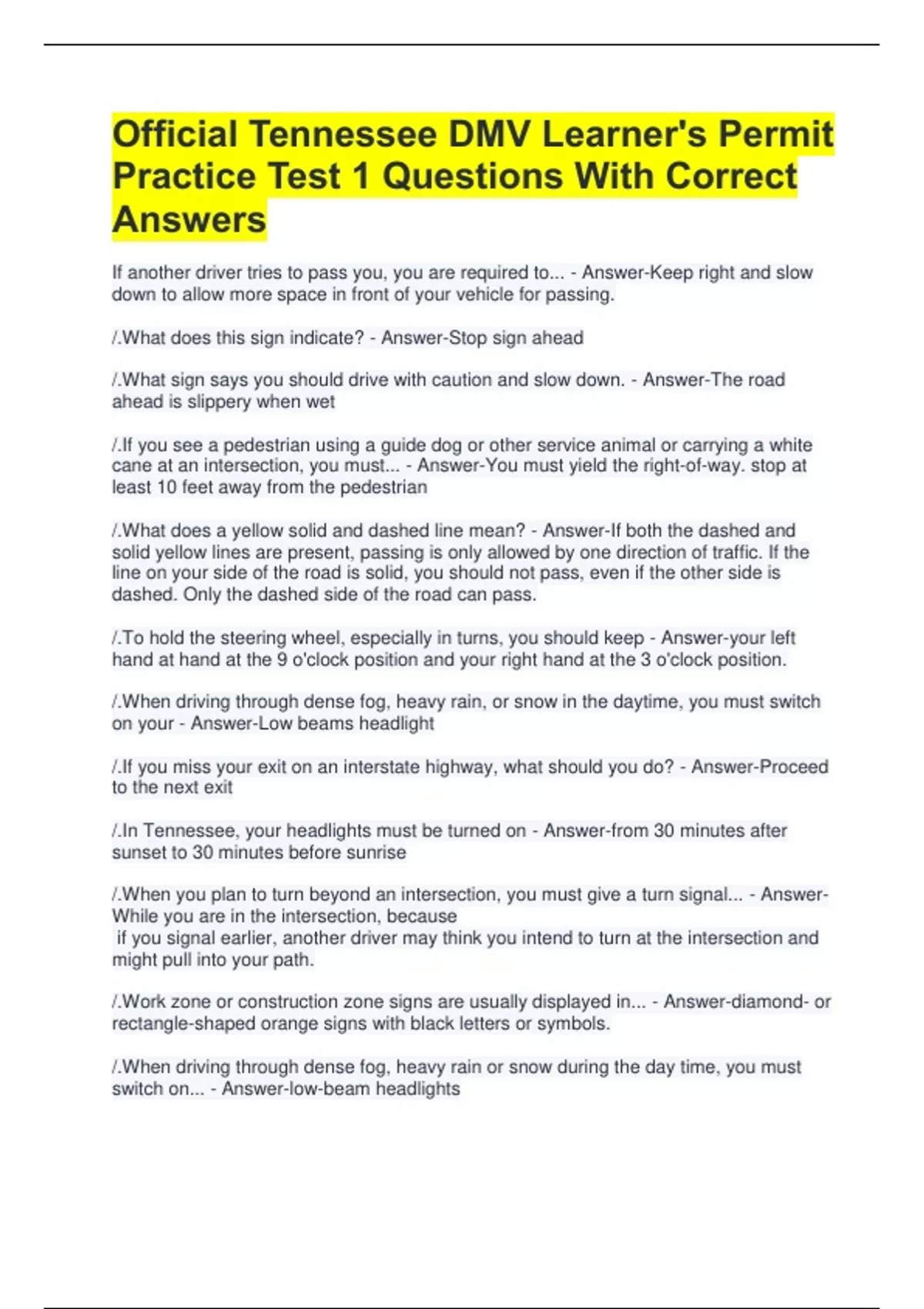 1 Exam (elaborations) DMV permit test Tennessee 2023 Questions With Certified Answers 2 Exam (elaborations) Official Tennessee DMV Learner s Permit Practice Test 1 Questions With Correct Answers 3 Exam (elaborations) Tenn. Driver s Permit Road Signs 100% Pass 4 Exam (elaborations) Tennessee Cat 3 Certification Test 100% solved 5 Exam (elaborati