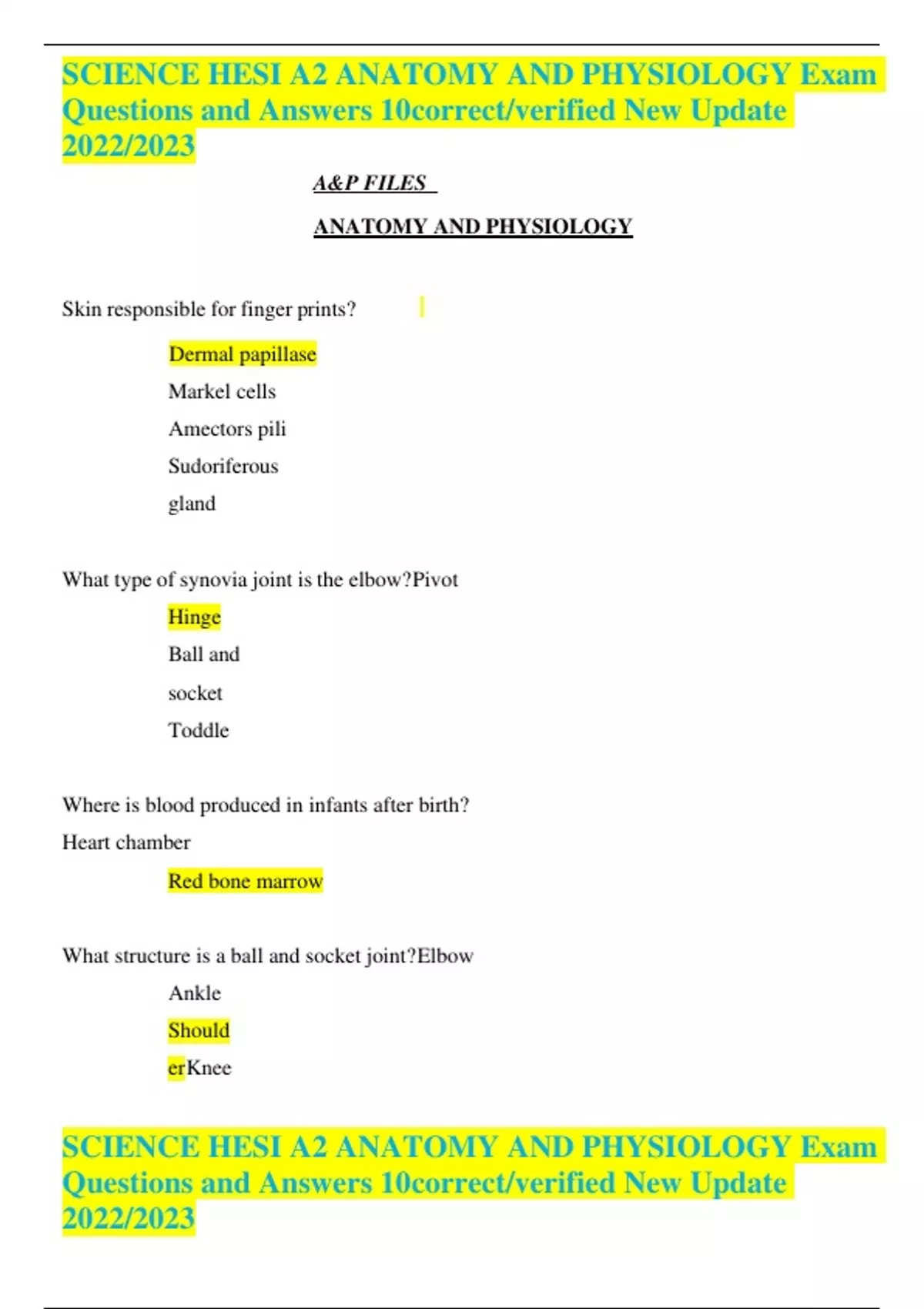 HESI A2 ANATOMY AND PHYSIOLOGY Exam Questions and Answers 10correct/verified New Update 2022/2023