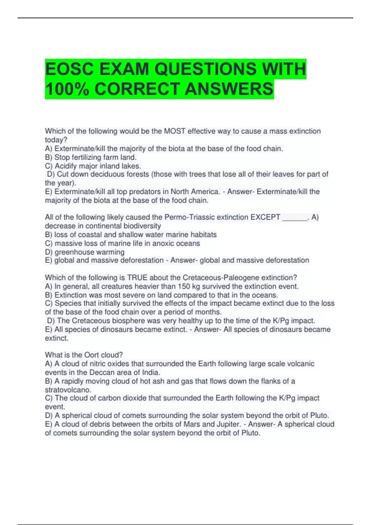 EOSC EXAM QUESTIONS WITH 100% CORRECT ANSWERS 2 Exam (elaborations) EOSC FINAL EXAM QUESTIONS AND REVISED ANSWERS 100% CORRECT 3 Exam (elaborations) EOSC FINAL PT 2 EXAM QUESTIONS AND CORRECT ANSWERS ALREADY PASSED 4 Exam (elaborations) EOSC Midterm Quizzes Questions with All Correct Answers 5 Exam (elaborations) EOSC Unit 4 Exam Questions and