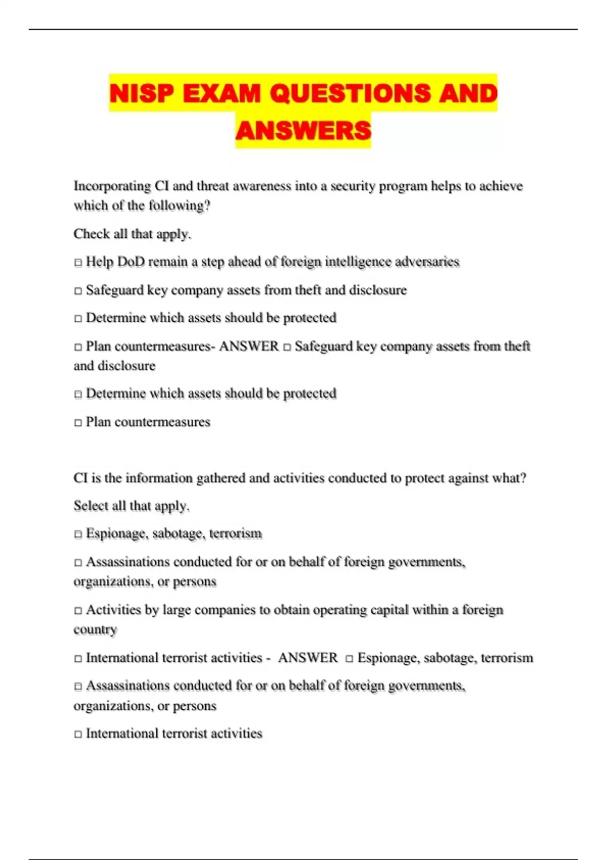 NISP PACKAGED DEAL EXAM WITH ALL QUESTIONS AND 100% VERIFIED ANSWERS