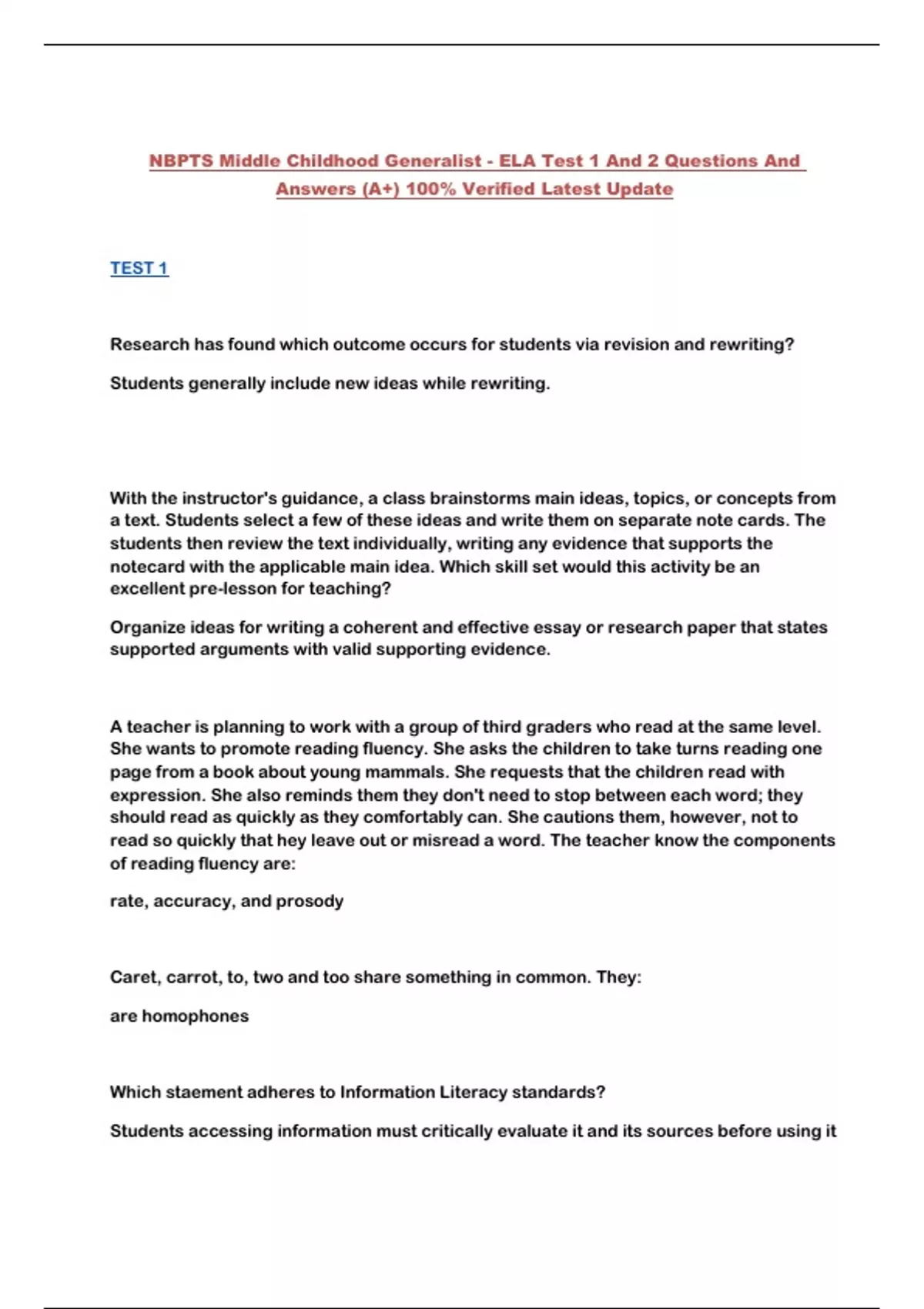 NBPTS Middle Childhood Generalist - ELA Test 1 And 2 Questions And Answers (A+) 100% Verified Latest Update