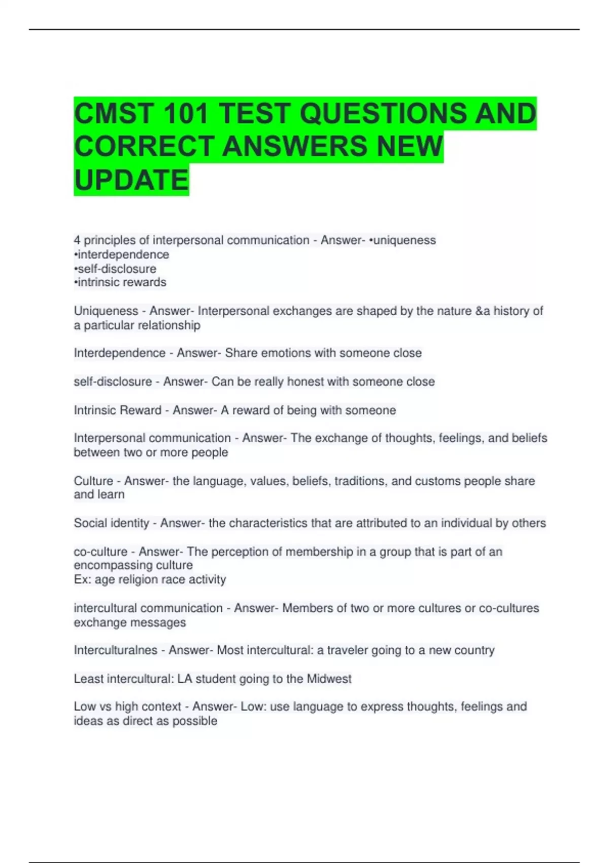 CMST 101 TEST QUESTIONS AND CORRECT ANSWERS NEW UPDATE 2 Exam (elaborations) CMST 101 Midterm Exam Questions and Answers 100% Correct 3 Exam (elaborations) CMST 101 STUDY GUIDE QUESTIONS WITH ALL CORRECT ANSWERS 4 Exam (elaborations) CMST 101 TEST 1 QUESTIONS WITH 100% CORRECT ANSWERS 5 Exam (elaborations) CMST 101 FINAL TEST QUESTIONS WITH 100