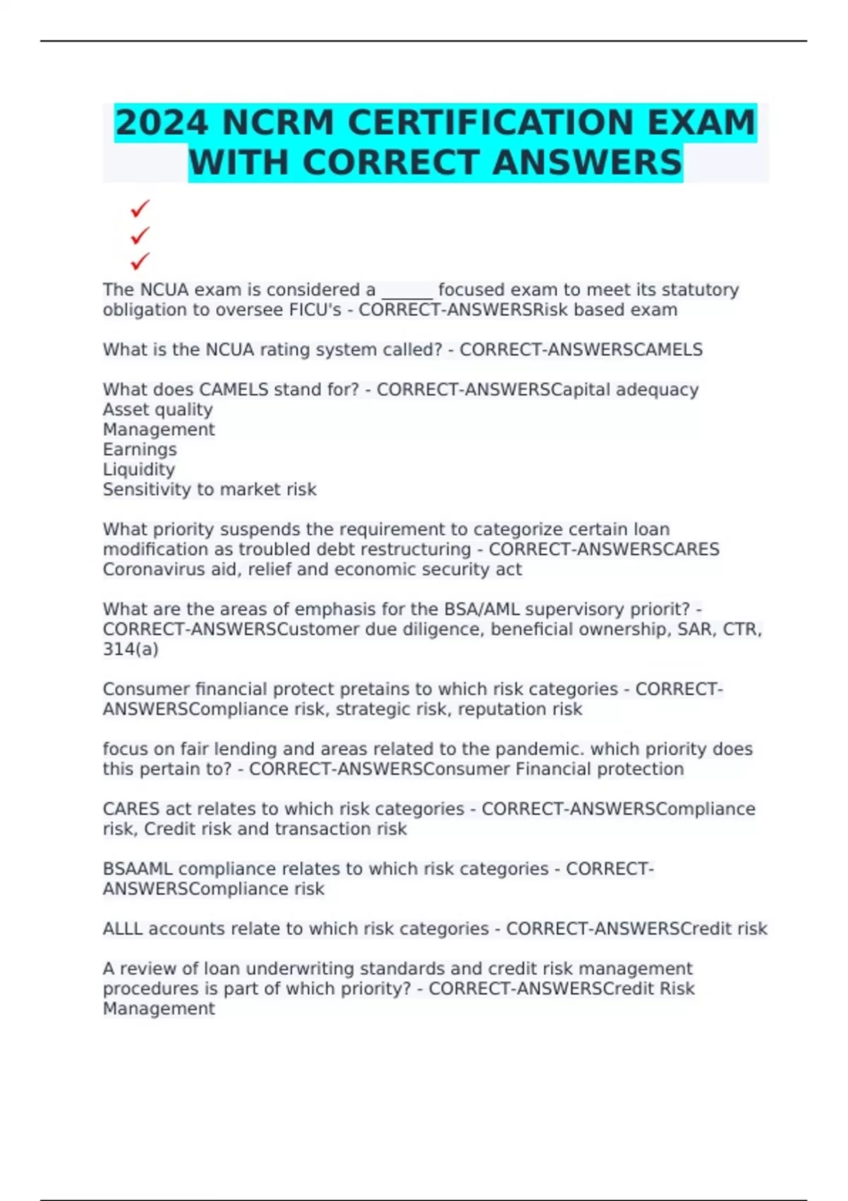 2024 NAFCU - NCRM EXAM STUDY GUIDE WITH CORRECT ANSWERS 2024 NAFCU - NCRM EXAM STUDY GUIDE WITH CORRECT ANSWERS 2024 NCRM CERTIFICATION EXAM WITH CORRECT ANSWERS