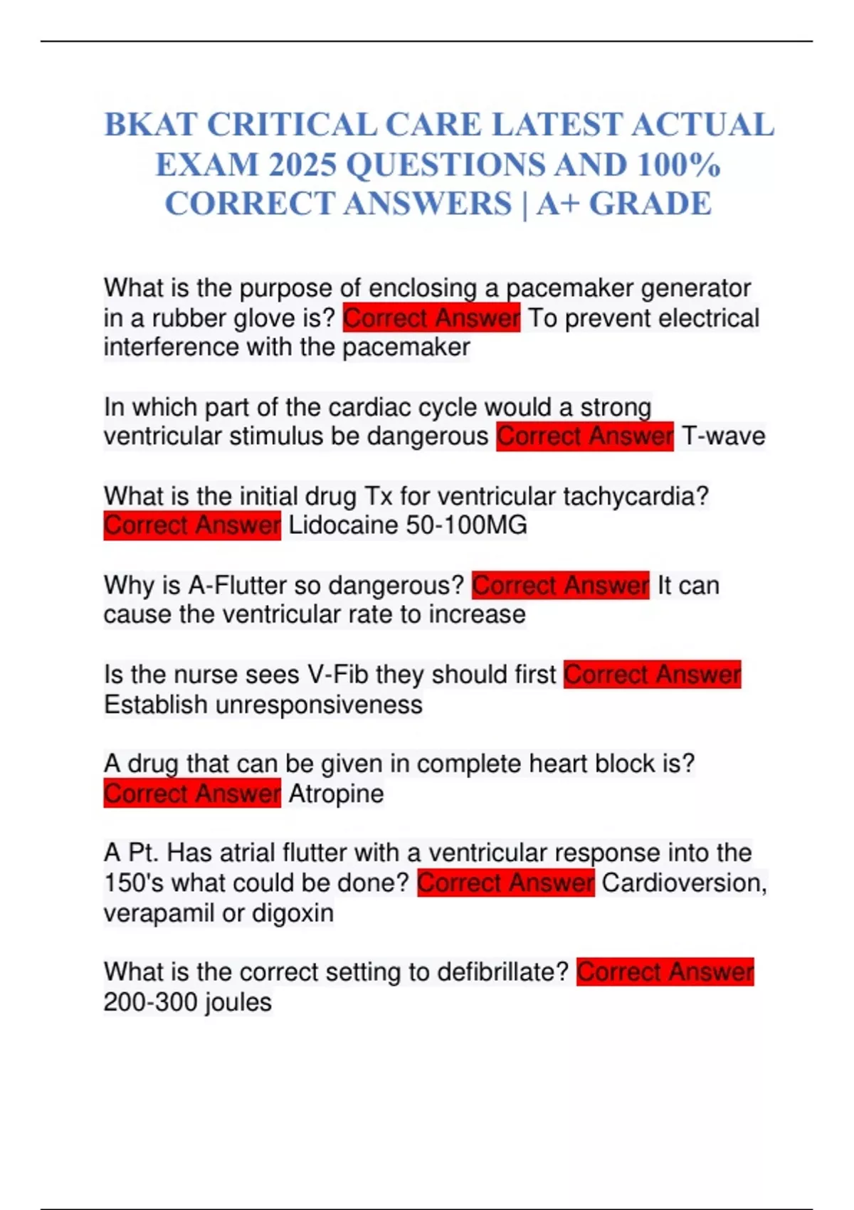 BKAT CRITICAL CARE LATEST ACTUAL EXAM 2025 QUESTIONS AND 100% CORRECT ANSWERS | A+ GRADE