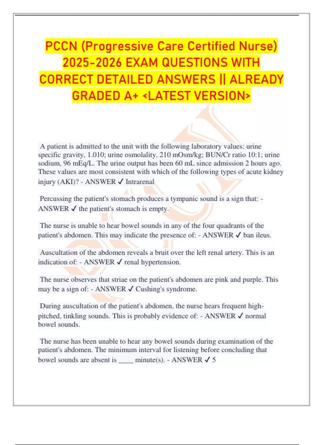 PCCN (Progressive Care Certified Nurse) Exam Questions with Correct Detailed Answers || Already Graded A + <Recent Update> || PCCN (Progressive Care Certified Nurse) EXAM QUESTIONS WITH CORRECT DETAILED ANSWERS || ALREADY GRADED A+ LATEST VERSION