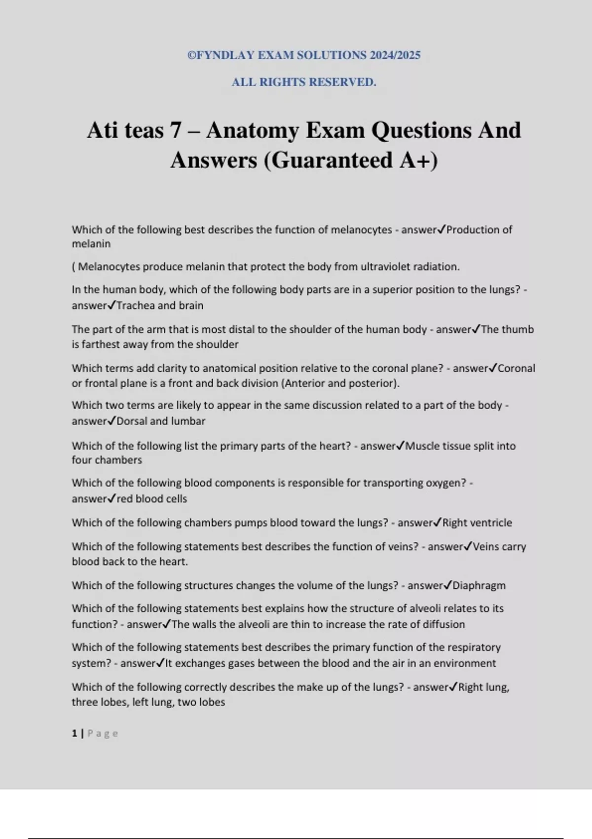 Ati teas 7 – Anatomy Exam Questions And Answers (Guaranteed A+)