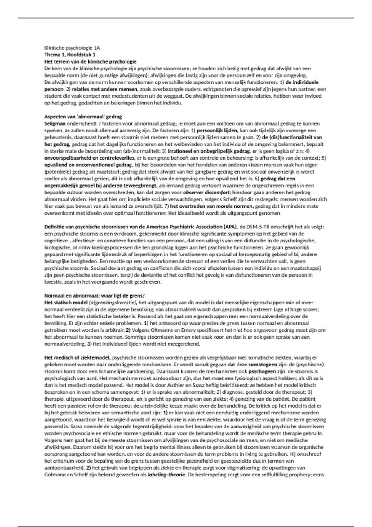 Samenvatting - Klinische psychologie 1A: theoretische benaderingen en persoonlijkheid (pb3002)