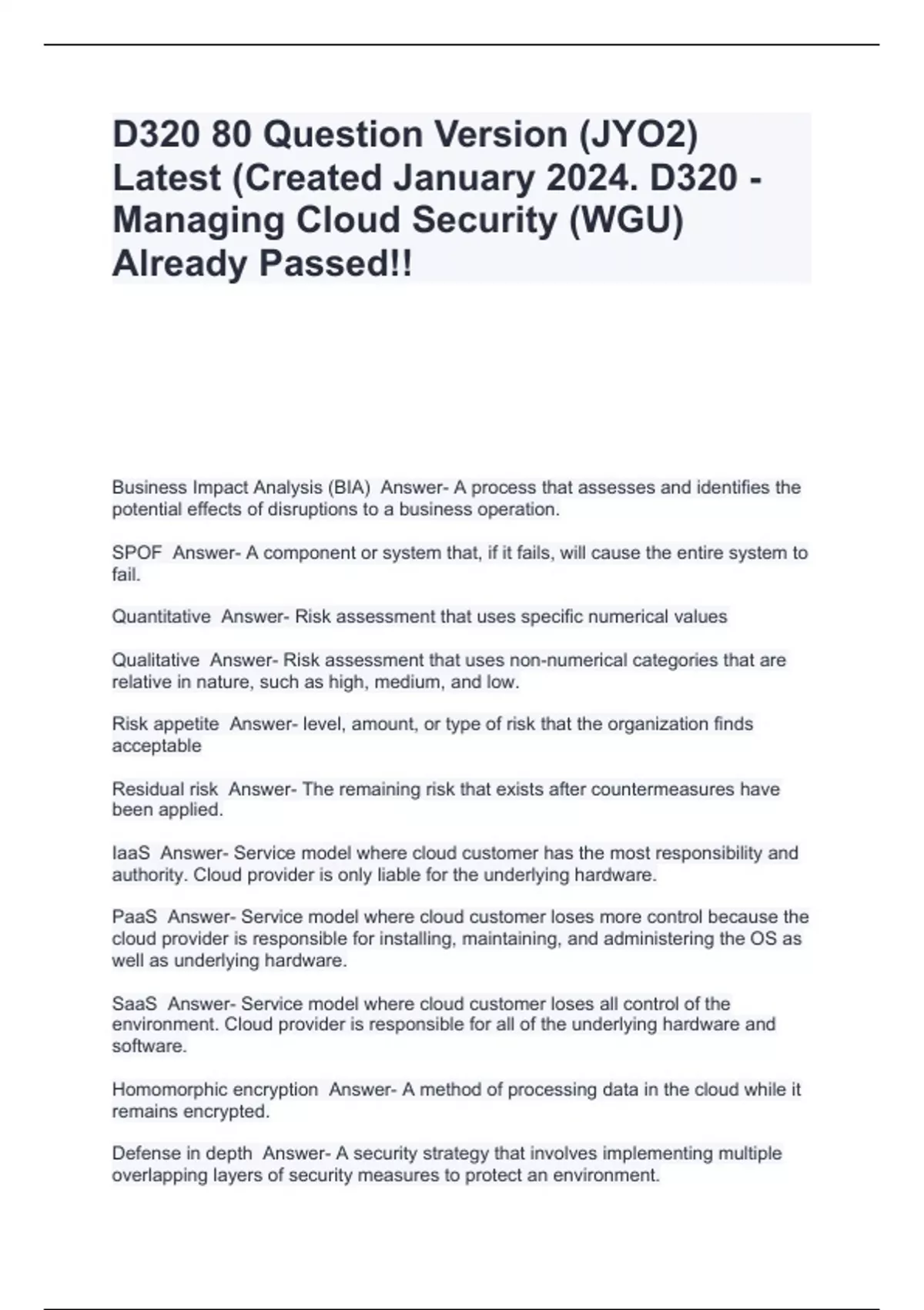 D320 80 Question Version (JYO2) Latest (Created January 2024. D320 - Managing Cloud Security (WGU) Already Passed!!,WGU D320 - Cloud Data Lifecycle (Cloud Security Management C838 Chapter 4 Cloud Data Security) Already Passed!!,WGU D320 - Managing Cloud Security (2024) Questions With Complete Solutions.,WGU D320 - Managing Cloud Security (2024) Qui