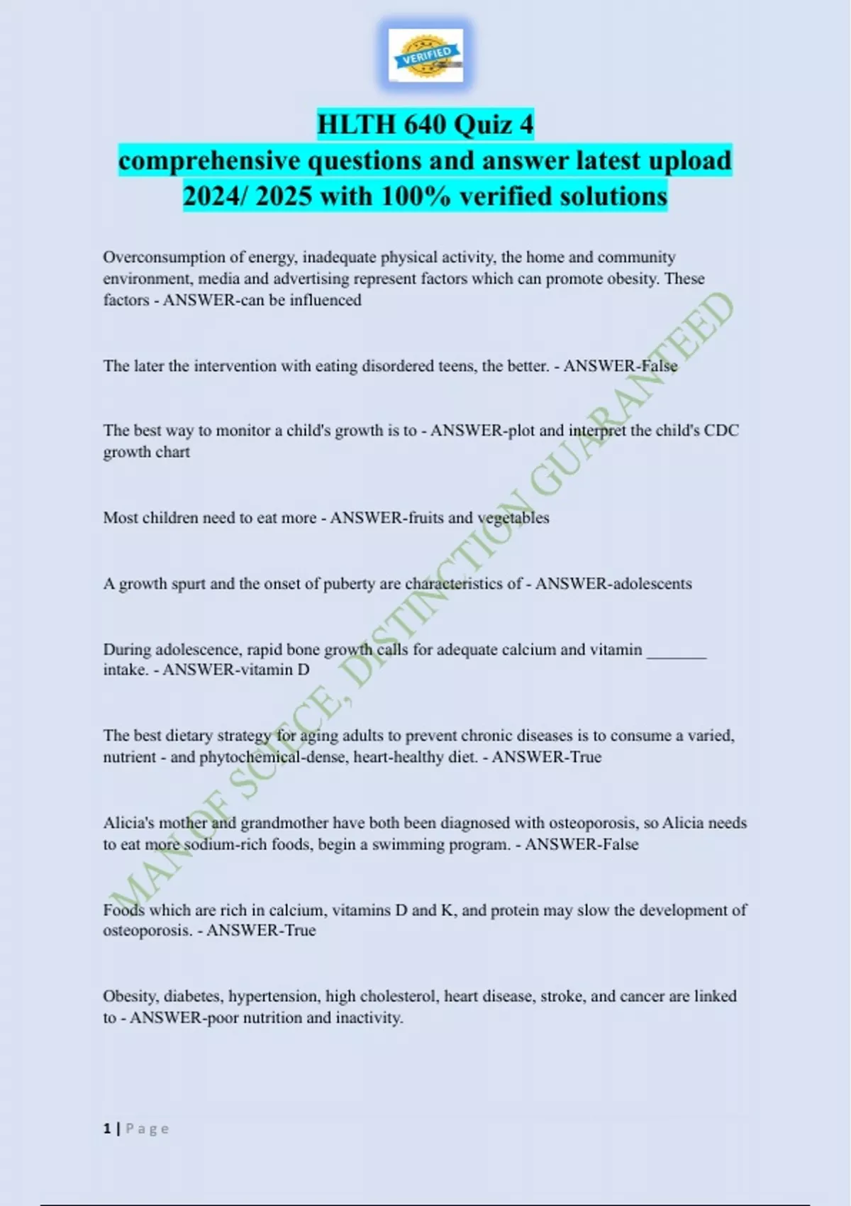 HLTH 640 Quiz 1-4 comprehensive questions and answer latest upload 2024/ 2025 with 100% verified solutions