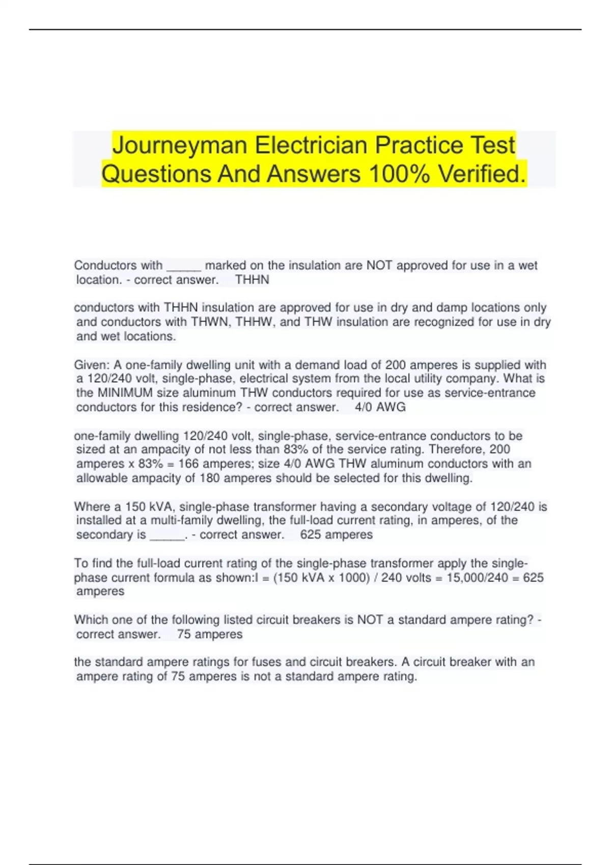 Journeyman Electrician Practice Test Questions And Answers 100% Verified.Electrical Journeyman Test 2020 Questions And Answers 100% Verified.Journeyman Electrician Exam Questions And Answers 100% Verified.NEC Journeyman Test Prep Questions And Answers Graded A+.