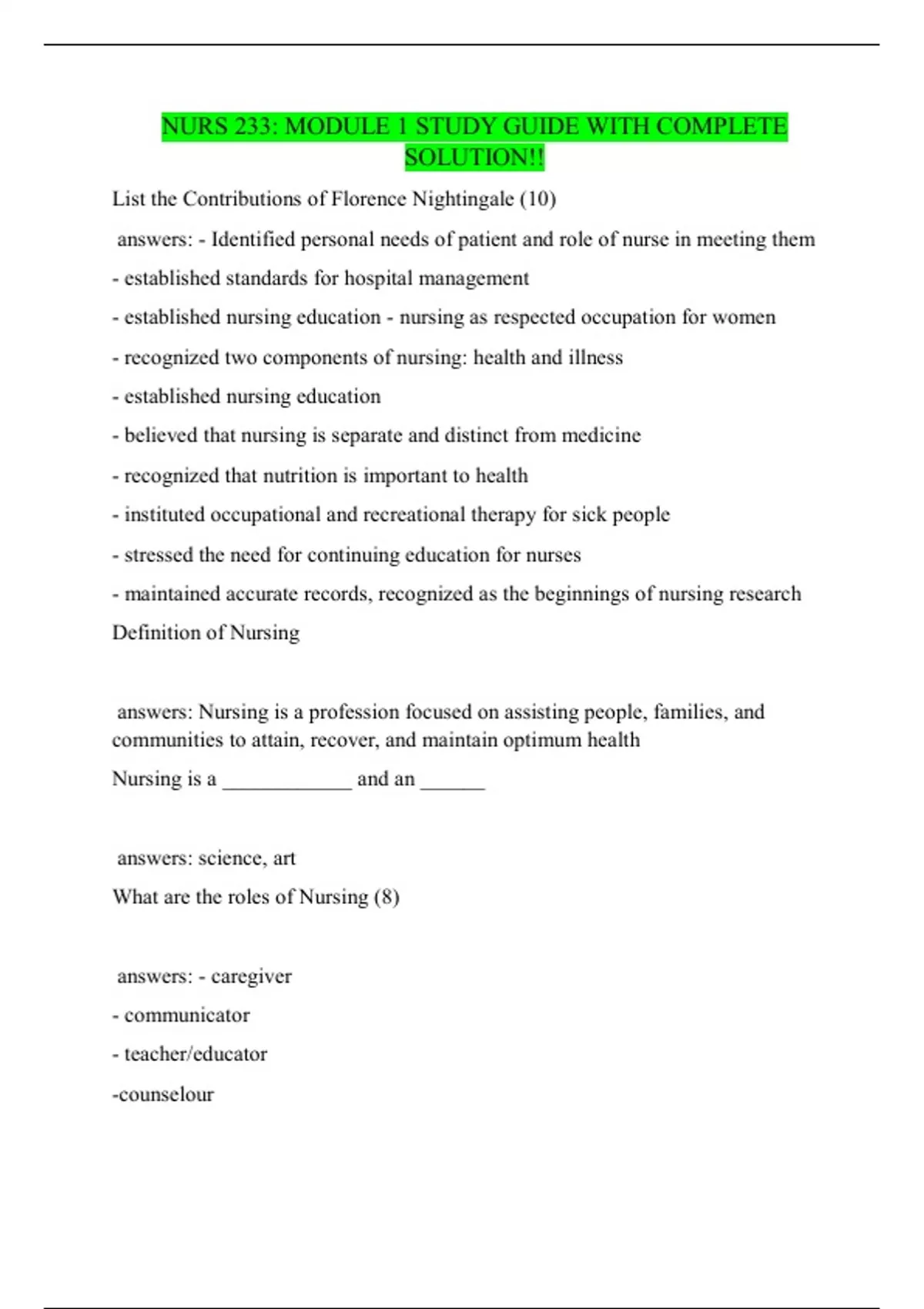 NURS 233 MODULE 1 ,2 AND 3 COMBINED STUDY GUIDE WITH COMPLETE SOLUTION!!