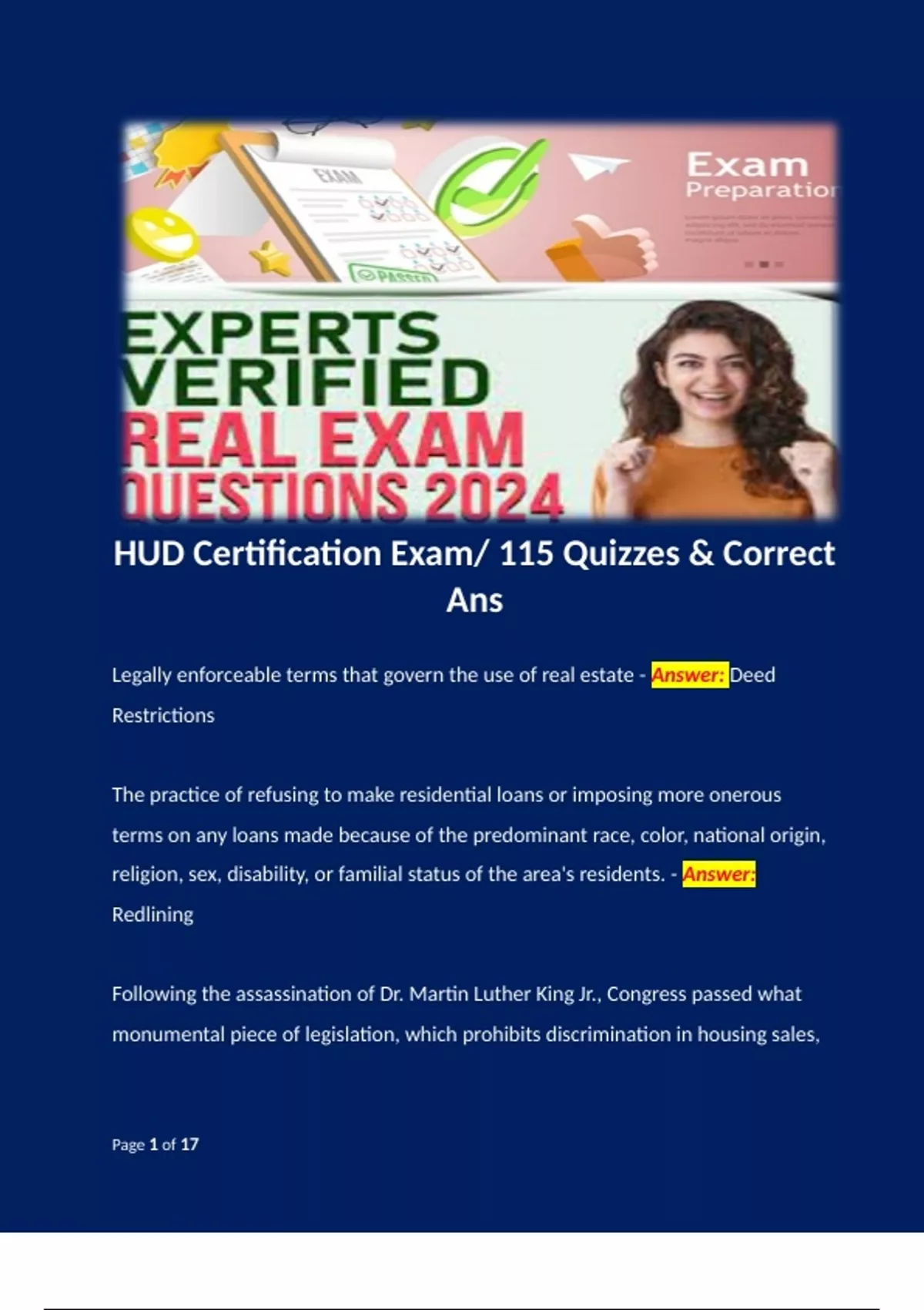 1 Exam (elaborations) HUD Certification Exam/ 115 Quizzes & Correct Ans 2 Exam (elaborations) HUD Exam- Homeownership/ Questions with Certified Answers. 3 Exam (elaborations) HUD Housing Counseling Exam/ 251 Q&A/ A+ Score Solution 4 Exam (elaborations) HUD Housing Counseling Exam/ 357 Quizzes & Correct Ans. 5 Exam (elaborations) HUD Housing Cou