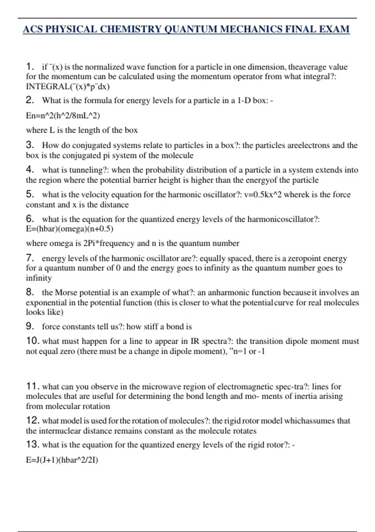 ACS PHYSICAL CHEMISTRY BUNDLE ( QUANTUM MECHANICS FINAL EXAM, THERMOCHEMISTRY STUDY GUIDE, PHYSICAL CHEMISTRY QUESTIONS ) 2024/2025 | QUESTIONS WITH 100% VERIFIED ANSWERS AND COMPREHENSIVE RATIONALES | GRADED A+