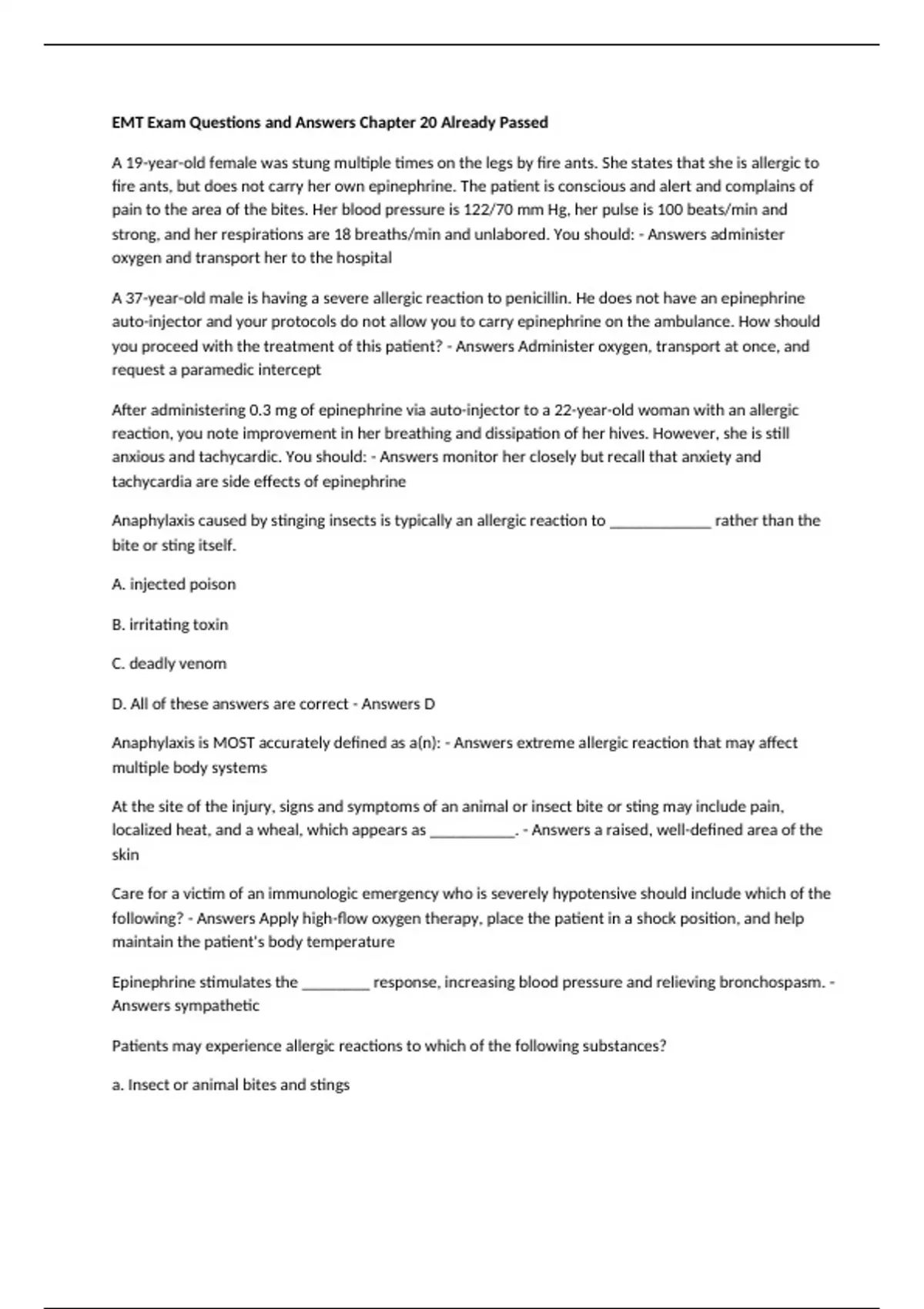 EMT Exam Questions and Answers Chapter 20 Already Passed