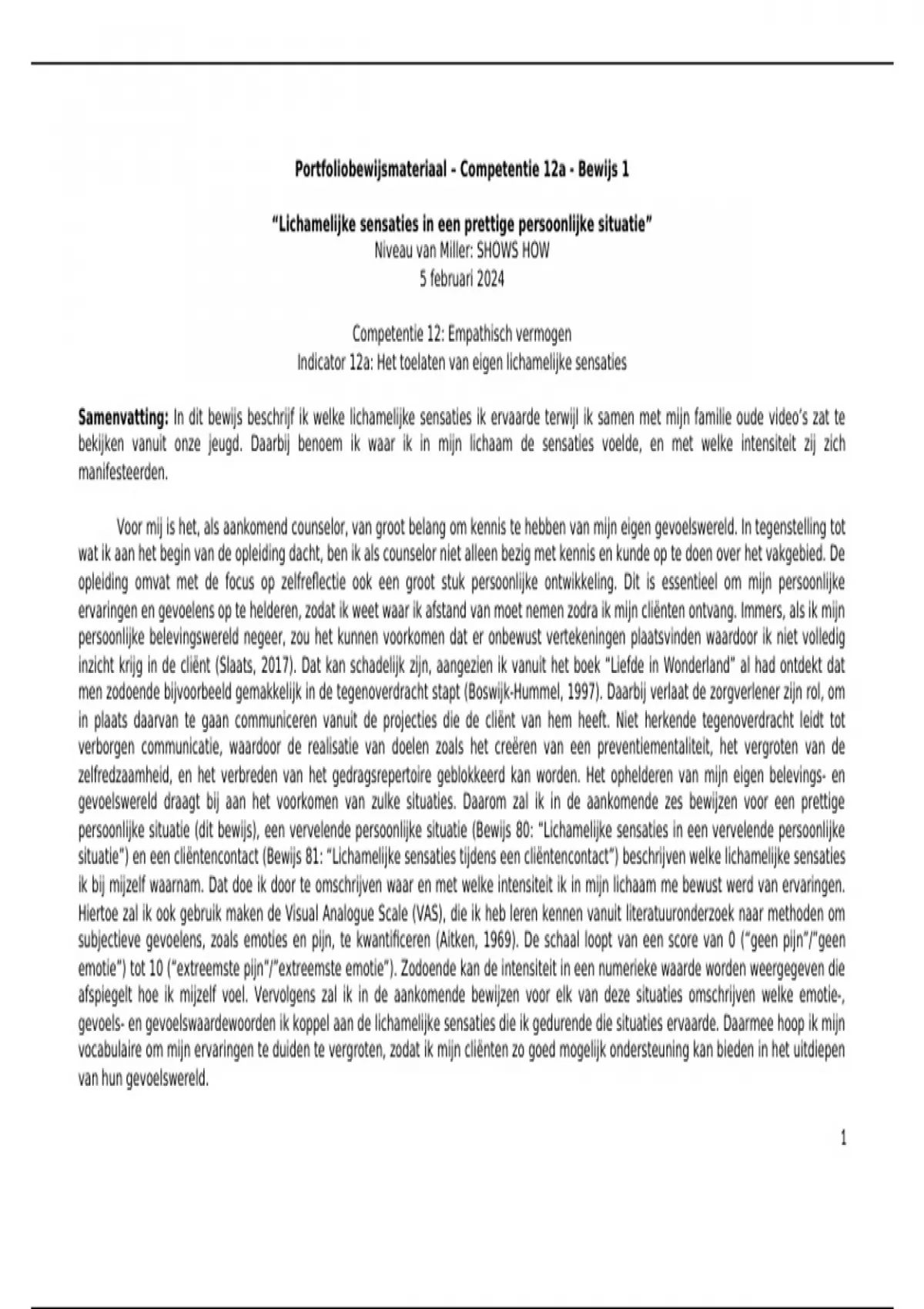 Deze bundel bevat de drie bewijzen die bij competentie 12a 'Het toelaten van eigen lichamelijke sensaties'. Deze bewijzen zijn uitstekend beoordeeld door mijn docenten.