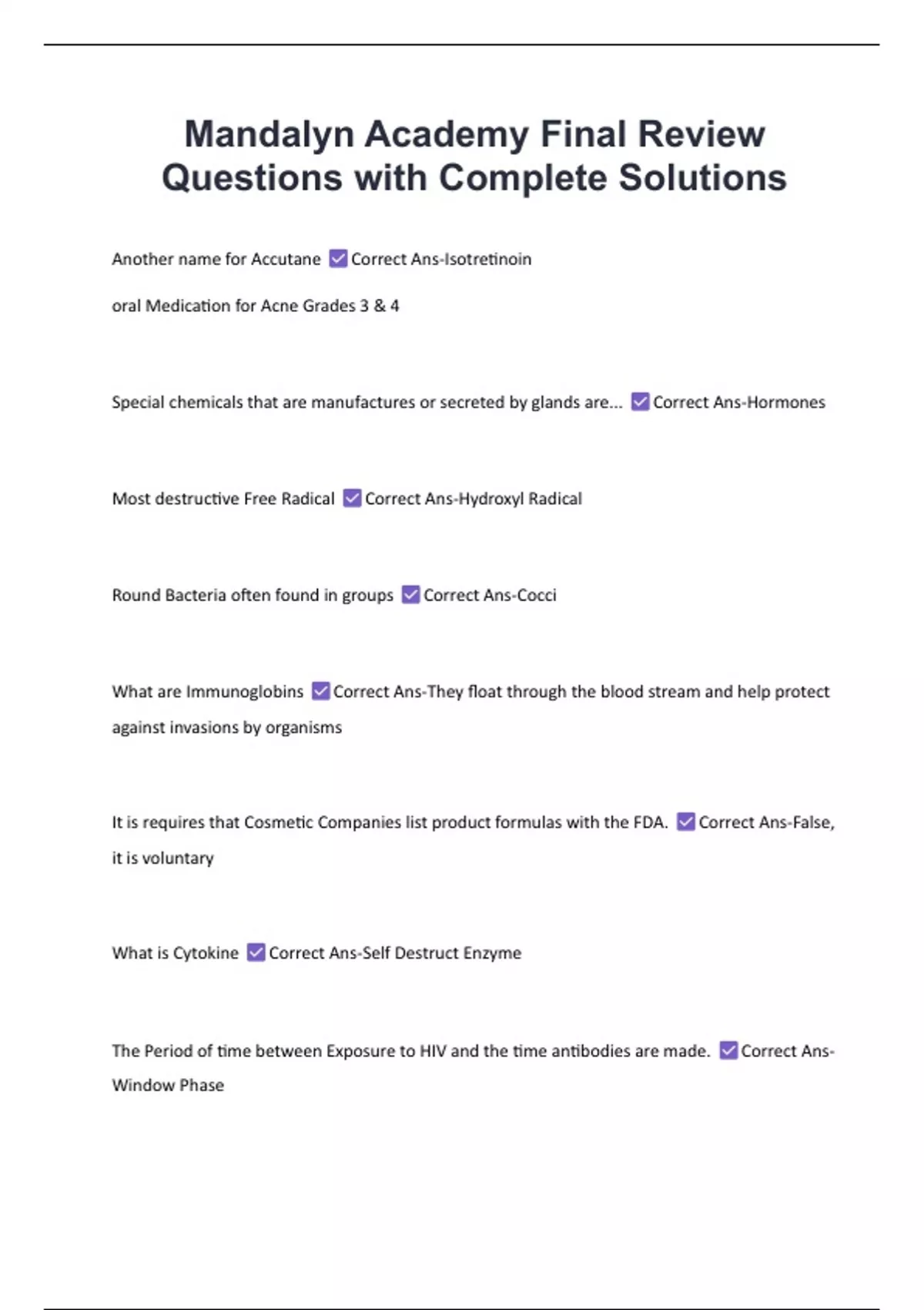 Mandalyn Academy Final Review Questions with Complete Solutions 2 Exam (elaborations) Mandalyn Academy Final – Master Questions & Answers 3 Exam (elaborations) Mandalyn Academy Final – Master Questions & Answers 4 Exam (elaborations) Mandalyn Academy Final Exam with Verified Solutions 5 Exam (elaborations) Chapter 3&9 Basics Mandalyn Academy- T