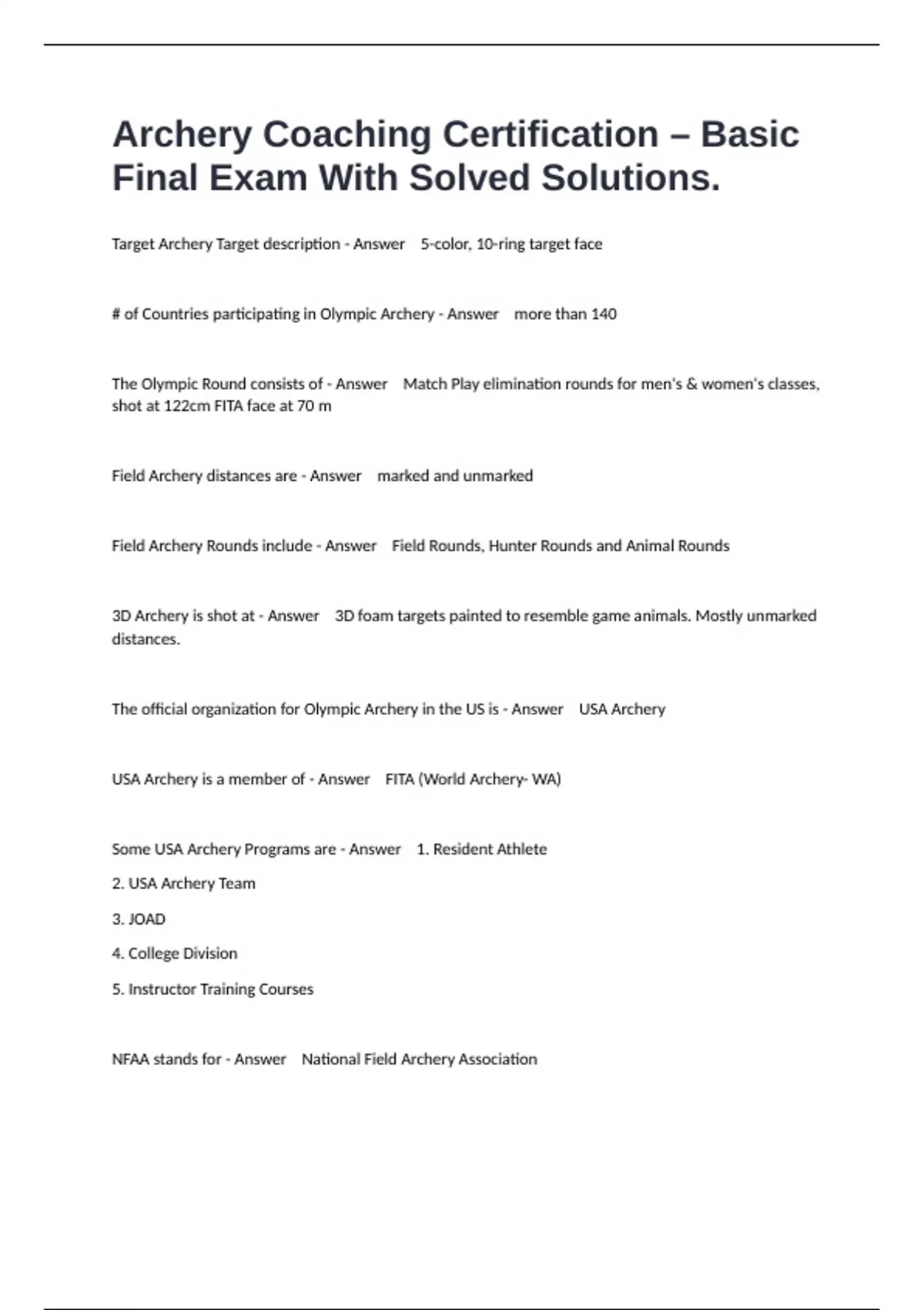 1 Exam (elaborations) USA Archery Level 1 Instructor Certification Test Questions Well Answered. 2 Exam (elaborations) S3DA Basic 3D Instructor Exam Questions And All Correct Answers. 3 Exam (elaborations) OGMS Archery Test Questions And All Correct Answers. 4 Exam (elaborations) NASP Archery Knowledge Exam Questions And All Correct Answers. 5