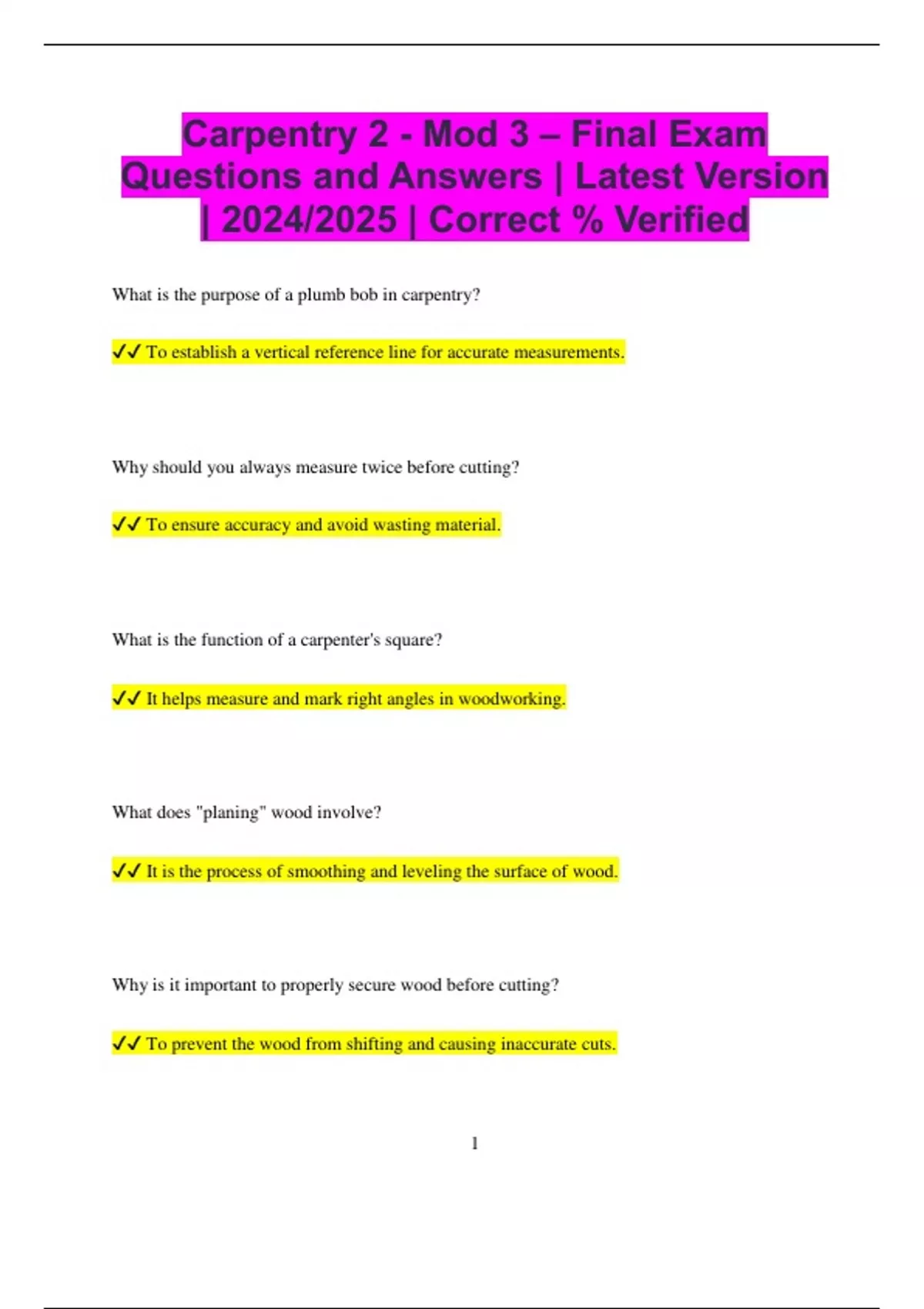 Carpentry 2 Bundled Exams Questions and Answers Latest Versions (2024/2025) (Complete and Accurate)