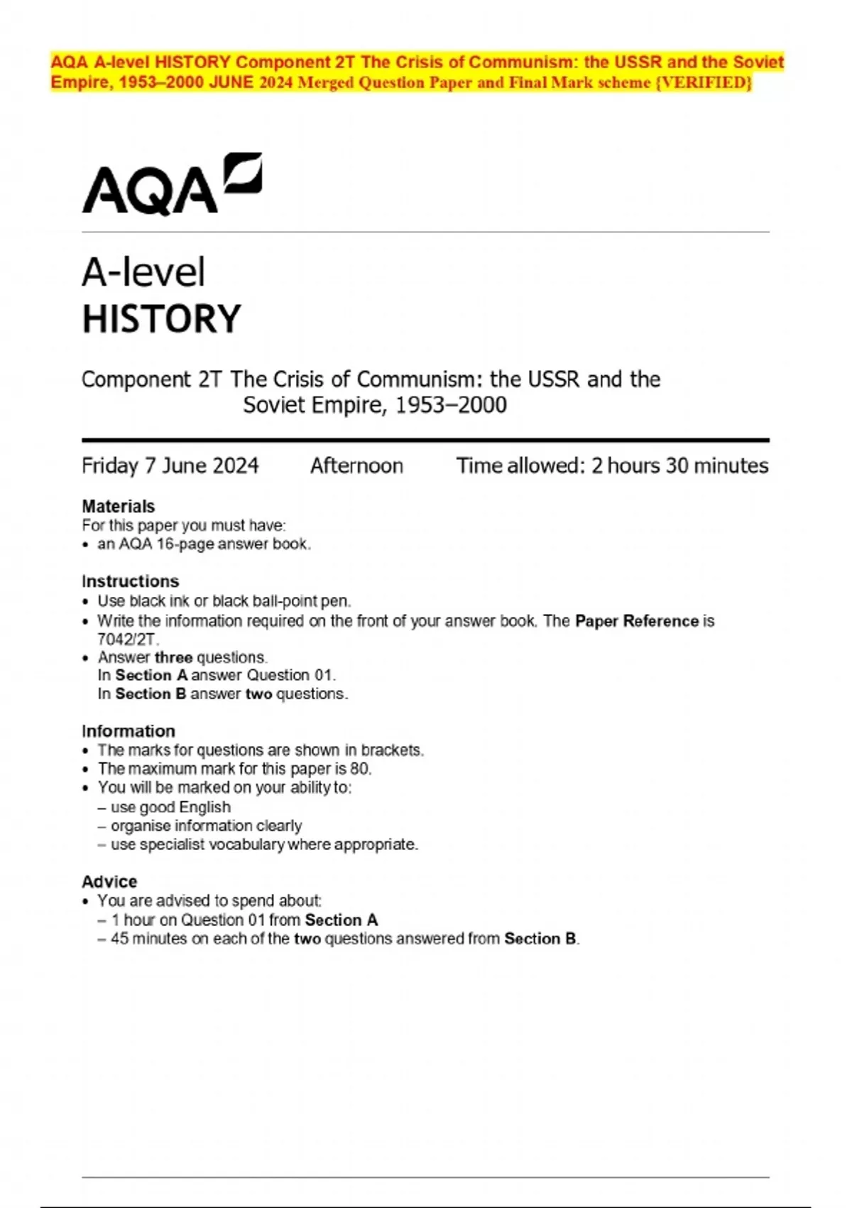 AQA A-level HISTORY Component 2T The Crisis of Communism: the USSR and the Soviet Empire, 1953–2000 JUNE 2024 Merged Question Paper and Final Mark scheme {VERIFIED}
