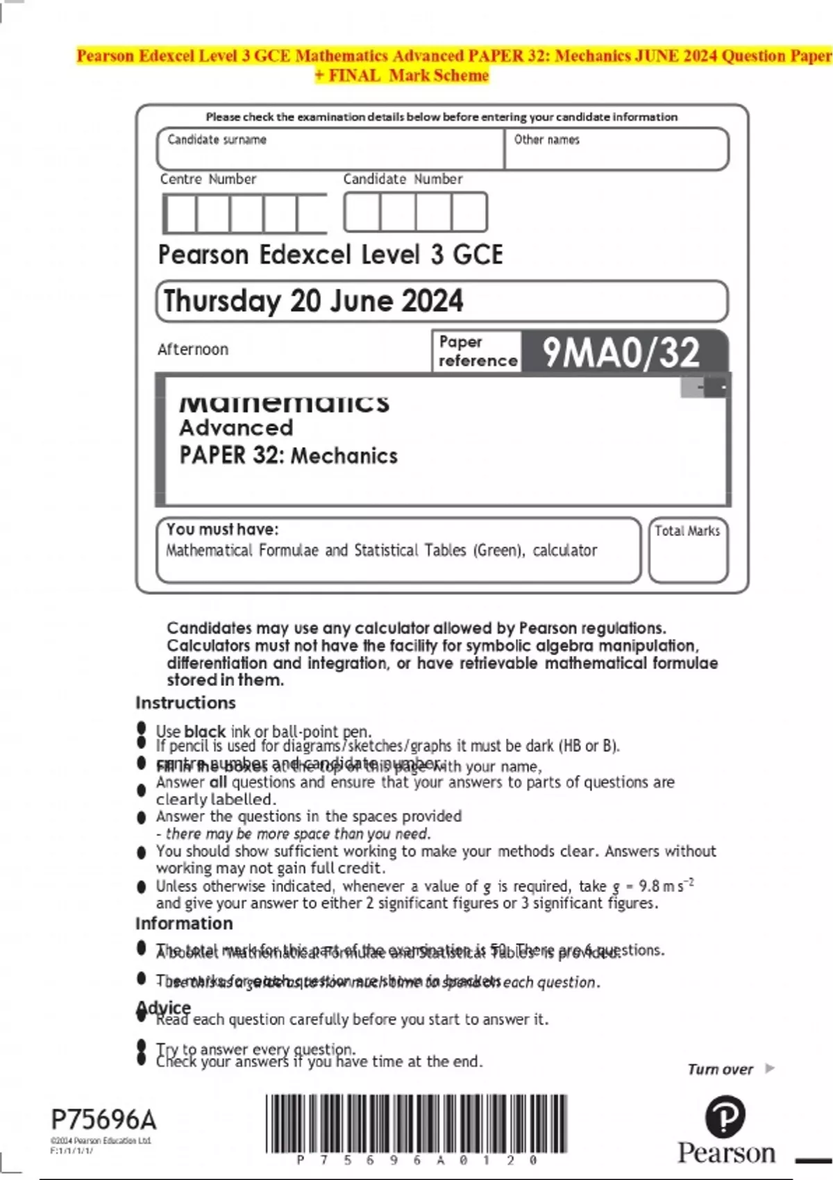 Pearson Edexcel Level 3 GCE Mathematics Advanced PAPER 32: Mechanics JUNE 2024 Question Paper + FINAL Mark Scheme