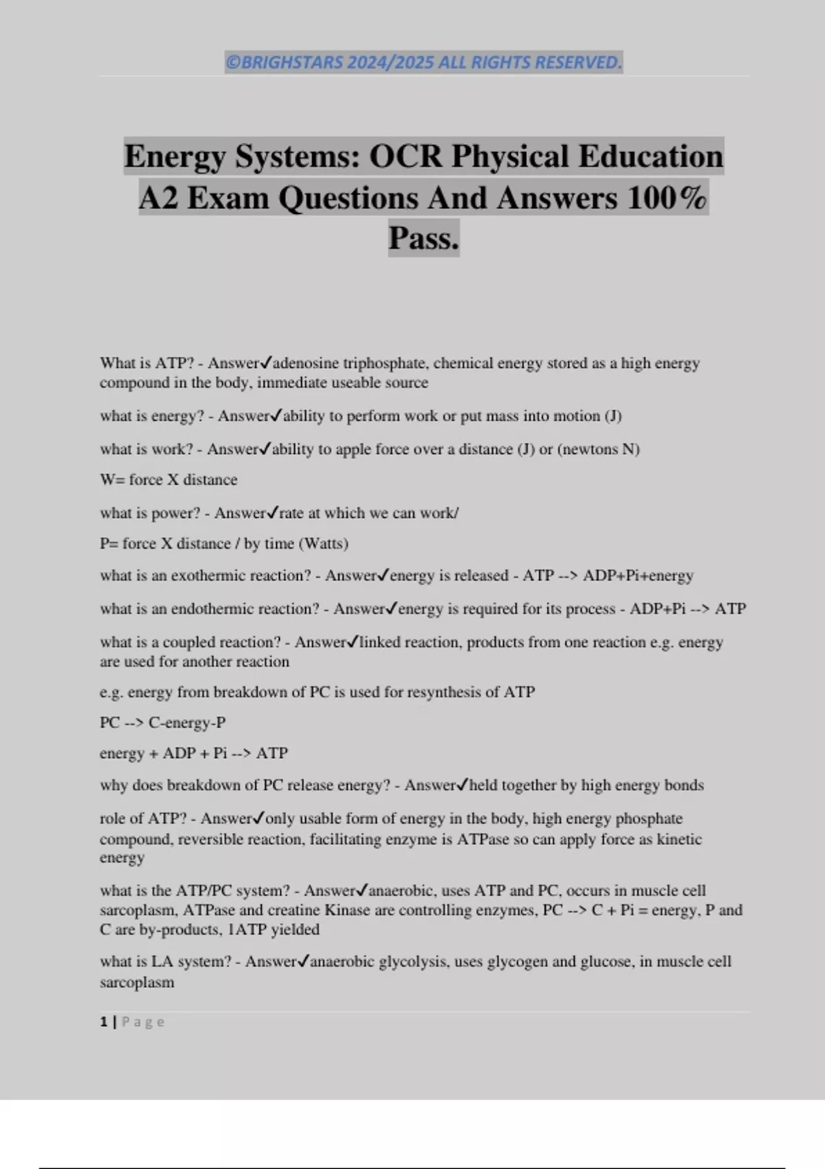 Energy Systems: OCR Physical Education A2 Exam Questions And Answers 100% Pass