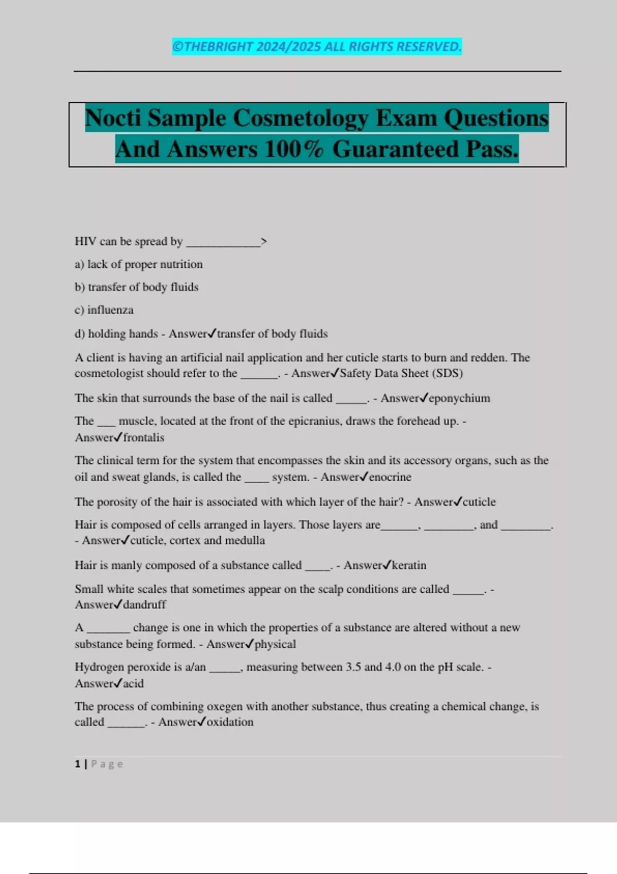 Nocti Sample Cosmetology Exam Questions And Answers 100% Guaranteed Pass.