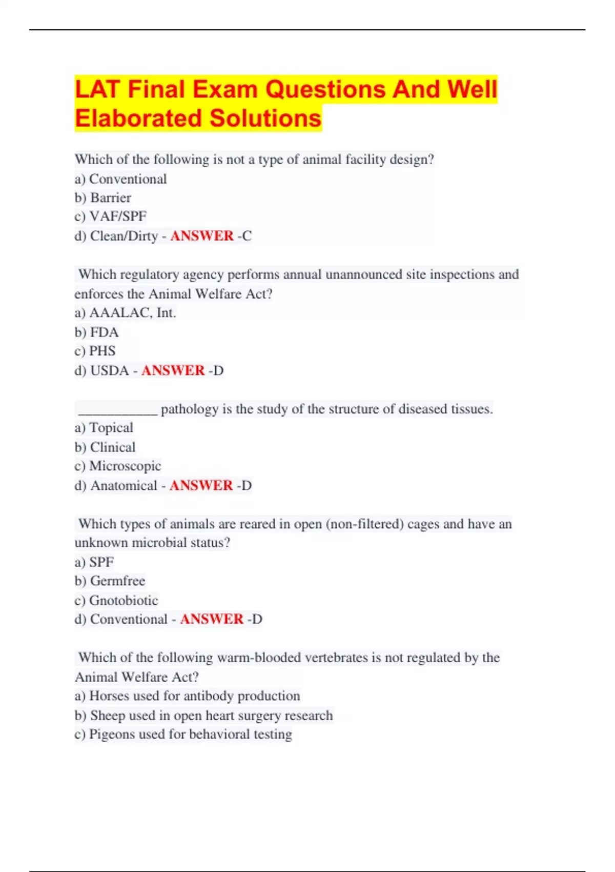 LAT (LABORATORY ANIMALCERTIFICATION) EXAM BUNDLE |Questions And Solutions |latest updates