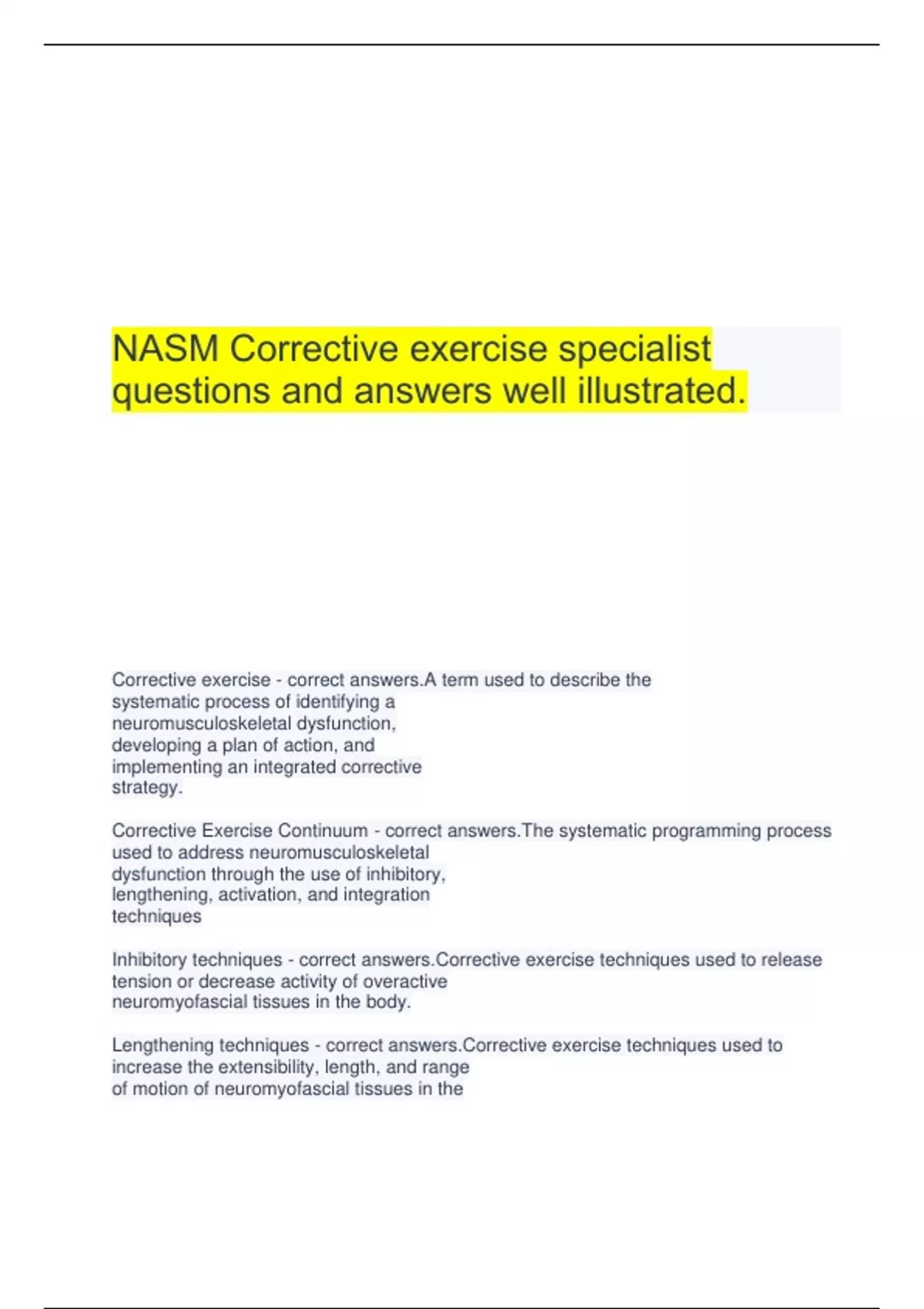 NASM Corrective exercise specialist questions and answers well illustrated.NASM CPT-7 Exam VERIFIED AND UPDATED 2025.NASM - Flexibility Training Questions And Answers Well Illustrated.NASM-CPT (7th Edition) Chapter 7 Verified And Updated 2025.NASM Nutrition Certification (EXAM) questions and answers 100% verified.