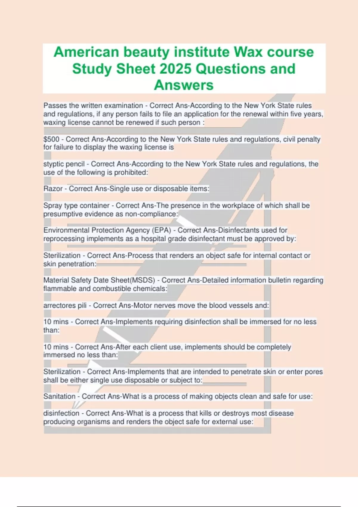 American beauty institute Wax course Study Sheet 2025 Questions and Answers