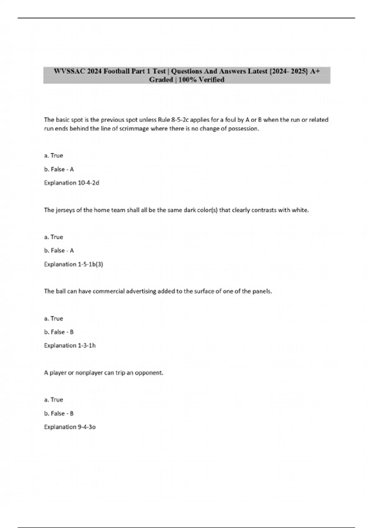 WVSSAC NFHS Football Part 2 Test | Questions And Answers 2 Exam (elaborations) WVSSAC NFHS Football Part 1 Test | Questions And Answers 3 Exam (elaborations) WVSSAC Football Pt. 1 Test 2024 | Questions And Answers 4 Exam (elaborations) WVSSAC Football Pt. 1 Test 2024 | Questions And Answers 5 Exam (elaborations) WVSSAC Football Part 2 Test 2024 | Q