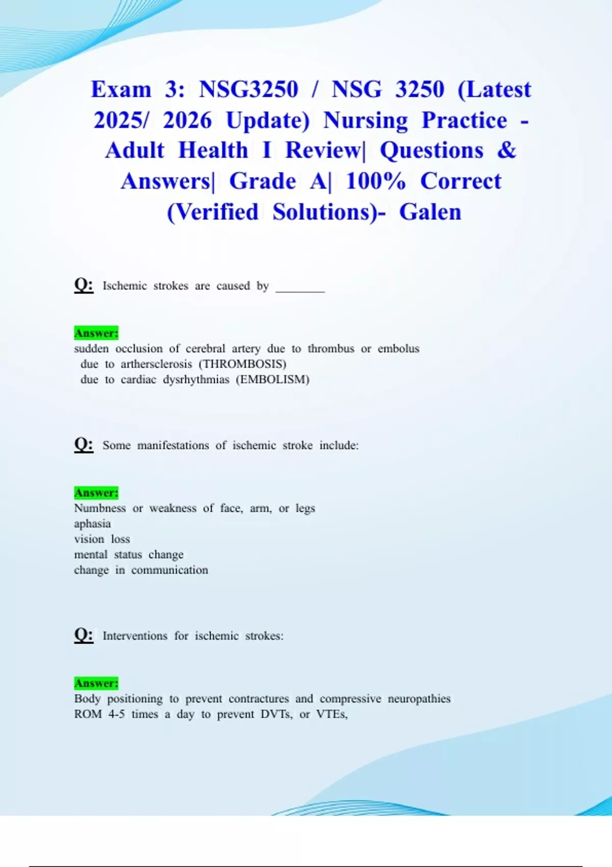 Exam 3: NSG3250 / NSG 3250 (Latest 2025/ 2026 Updates STUDY BUNDLE PACKAGE WITH SOLUTIONS) Nursing Practice - Adult Health I | Questions & Answers| Grade A| 100% Correct (Verified Solutions)- Galen