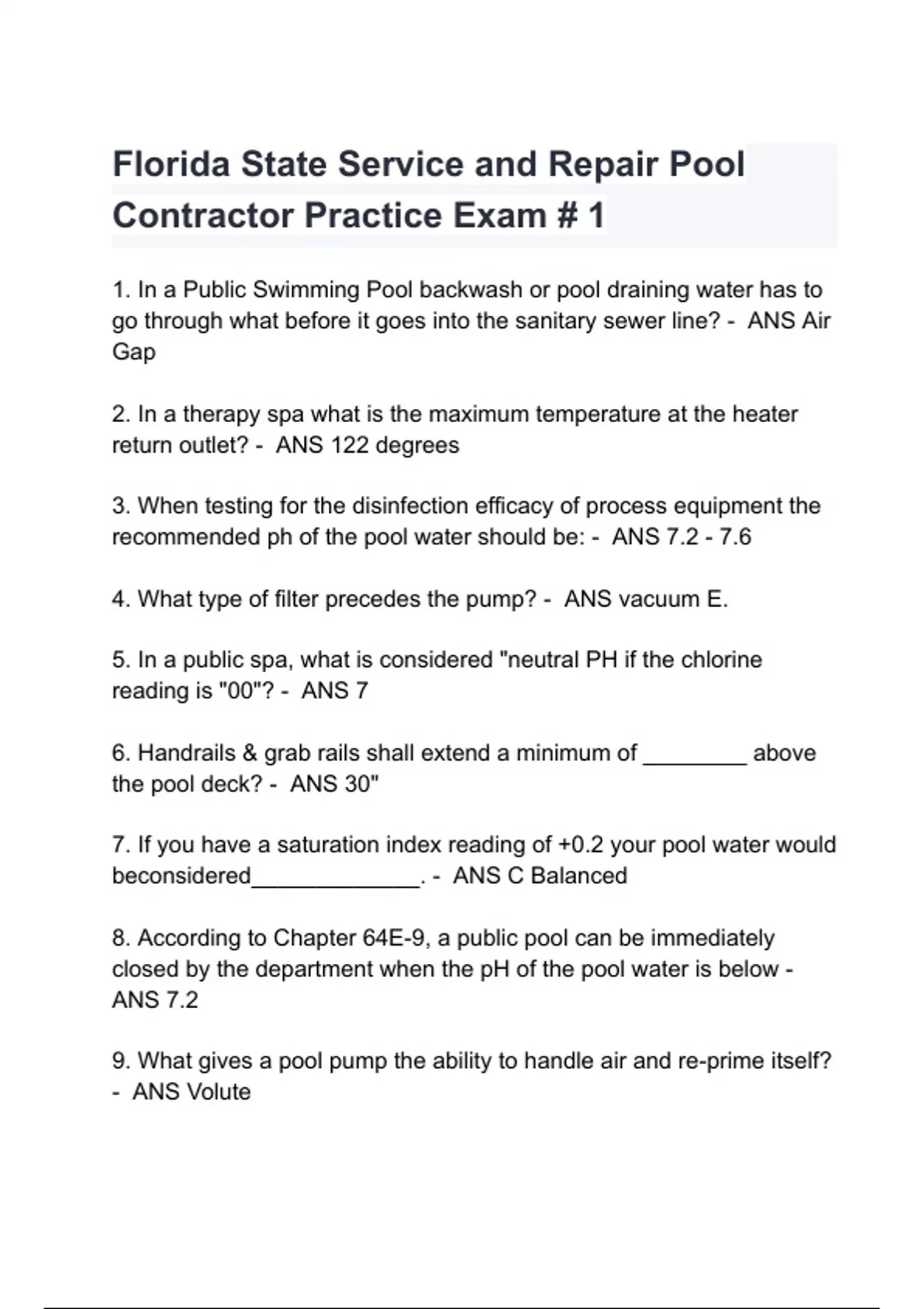 Florida State Service and Repair Pool Contractor Practice Exam # 1 Questions with correct Answers 2024/2025( A+ GRADED 100% VERIFIED).