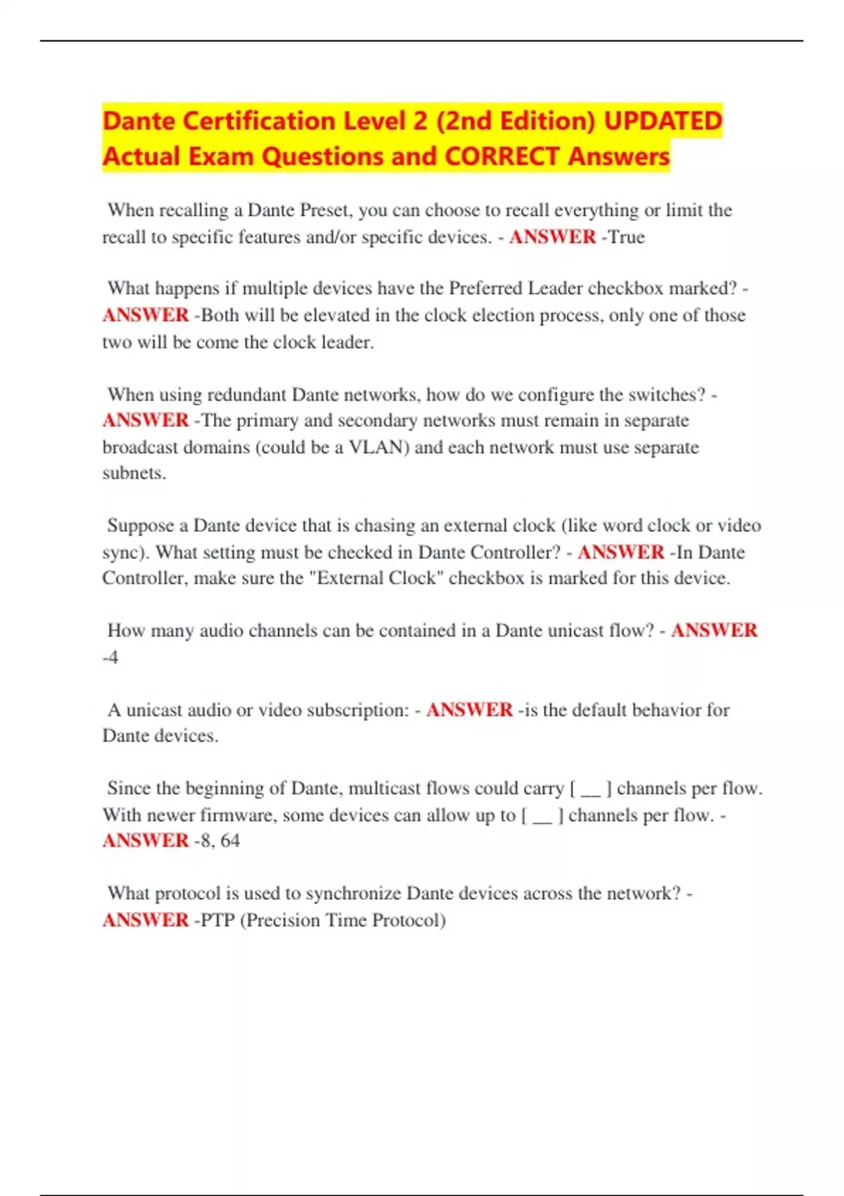DANTE CERTIFICATION LEVEL 1& 2 Exam Bundle | Questions And Answers Verified 100% Correct | Latest updates