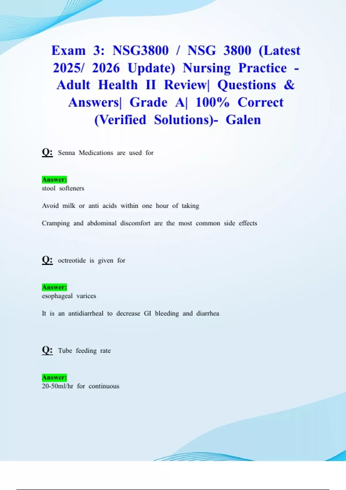 Exam 3: NSG3800 / NSG 3800 (Latest 2025/ 2026 Updates STUDY BUNDLE PACKAGE WITH SOLUTIONS) Nursing Practice - Adult Health II | Questions & Answers| Grade A| 100% Correct (Verified Solutions)- Galen