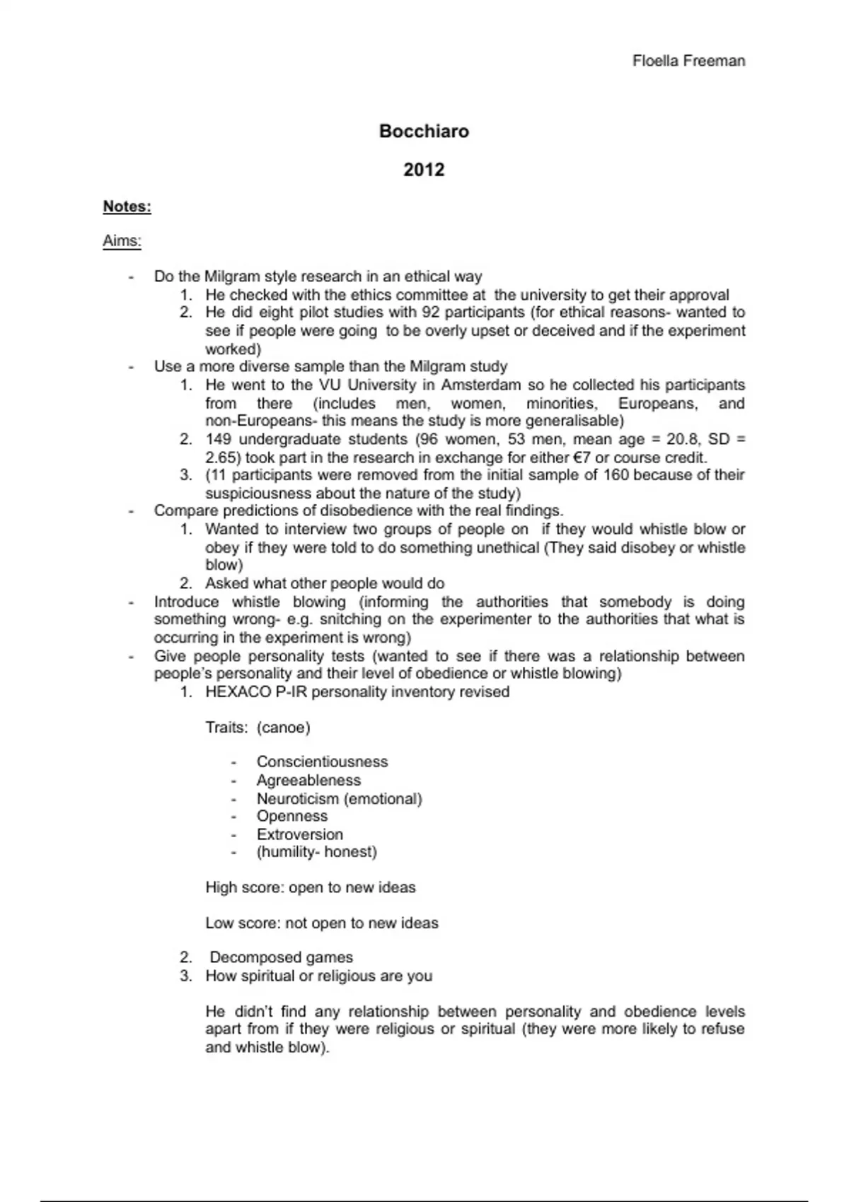 These two documents contain key information and 10 questions / answers on the core study Bocchiaro in the social area in a-level psychology.