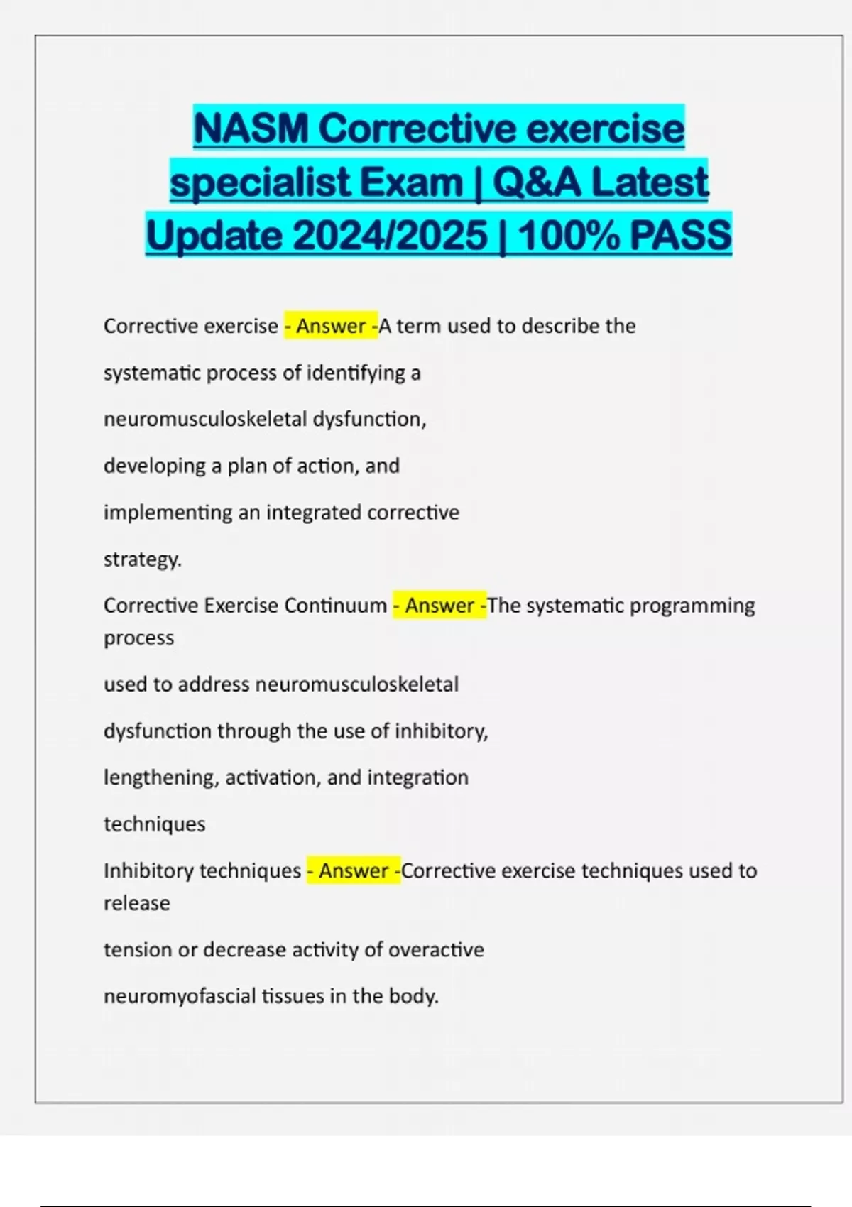 NASM CES (CORRECTIVE EXERCISE SPECIALIST) BUNDLED EXAMS | QUESTIONS AND CORRECT ANSWERS | LATEST UPDATE 2024/2025