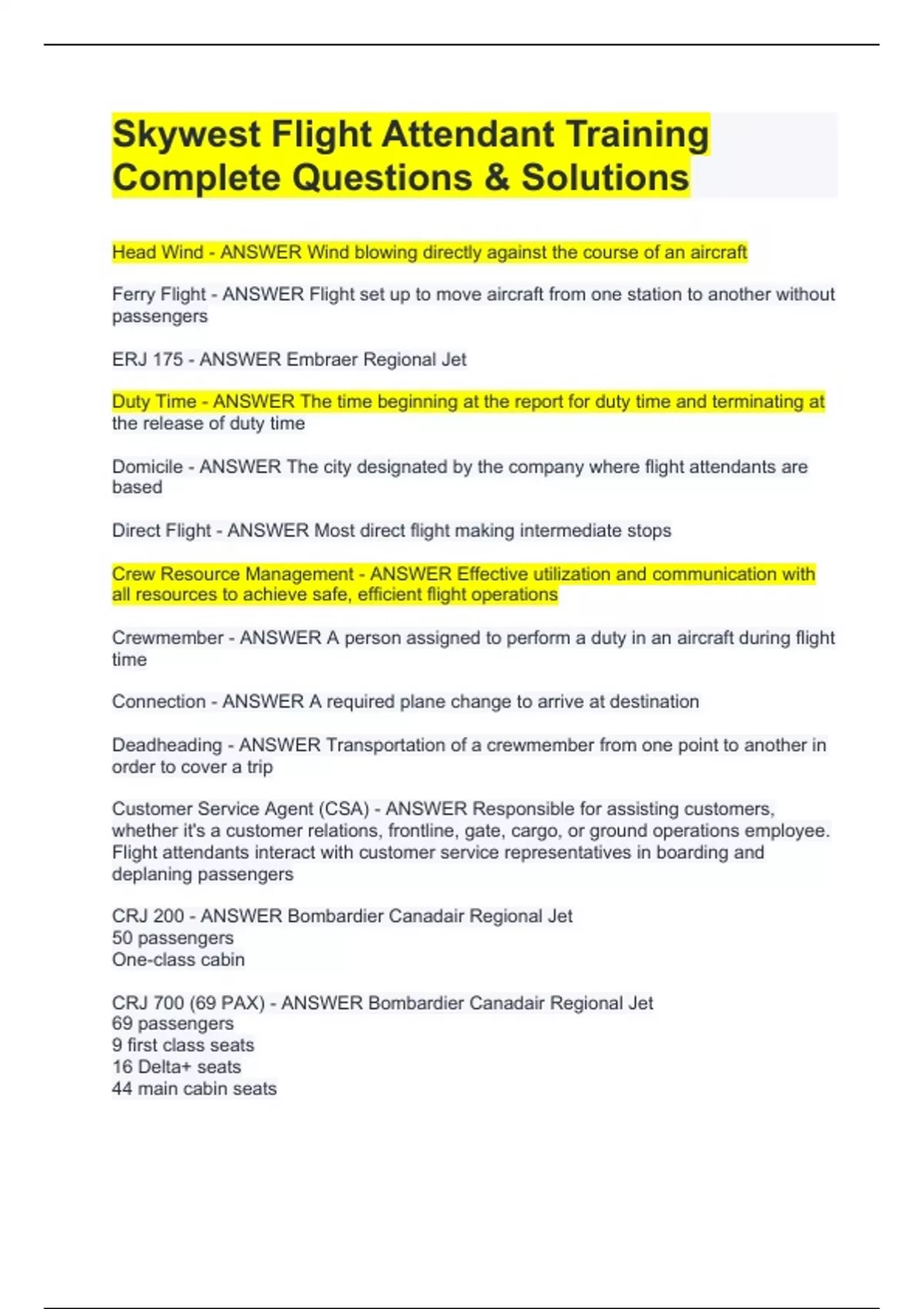 SKYWEST FLIGHT ATTENDANT - PRE-ENTRANCE EXAM (DEFINITIONS)CORRECT 100%COMPLETE EXAM BUNDLE