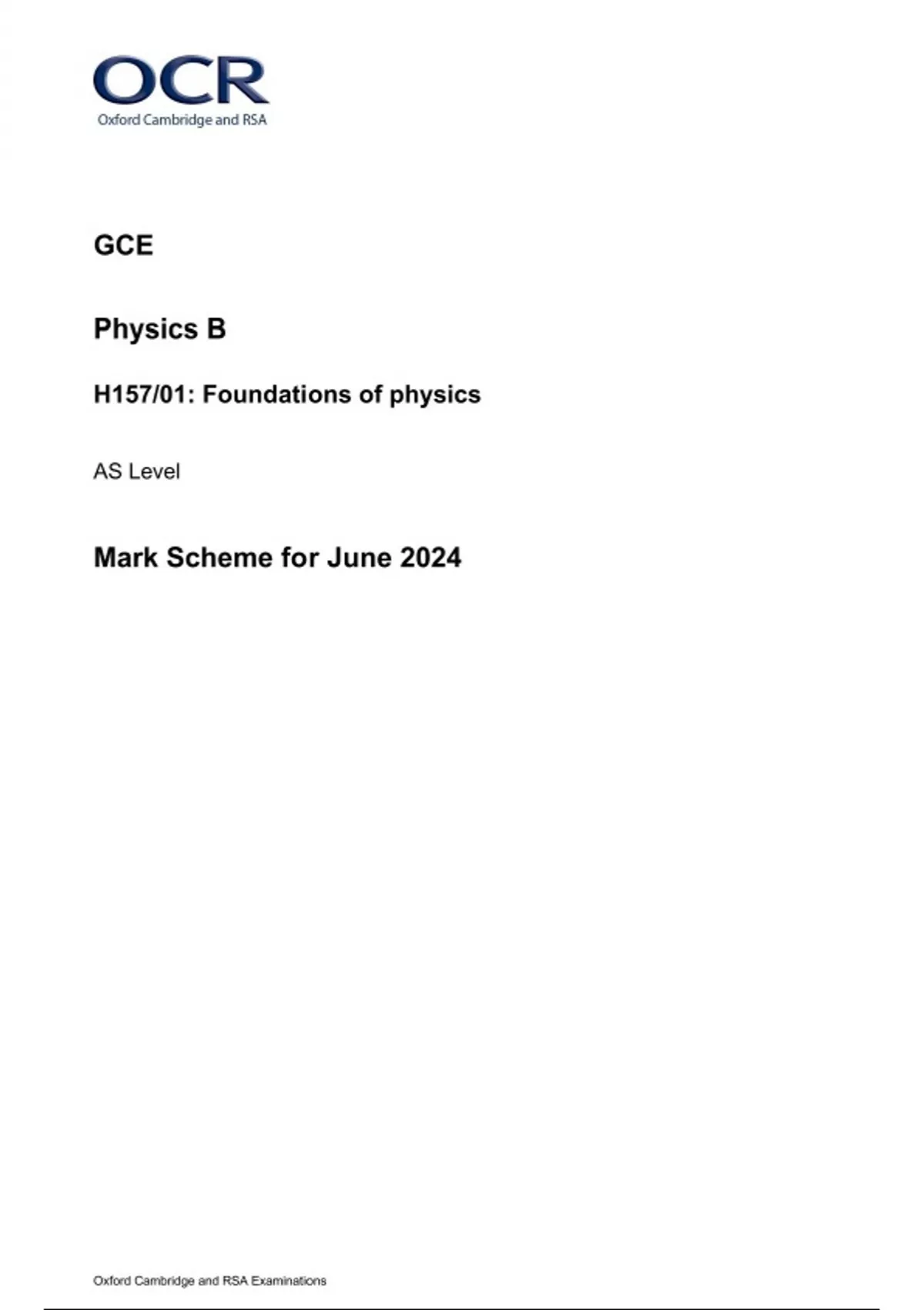 OCR AS Level Physics B (Advancing Physics) H157/01 JUNE 2024 QUESTION PAPER AND MARK SCHEME