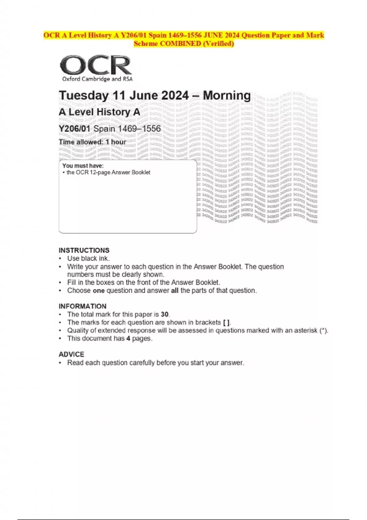 2024 OCR A Level History A Y206/01 Spain 1469–1556 JUNE Question Paper and Mark Scheme COMBINED