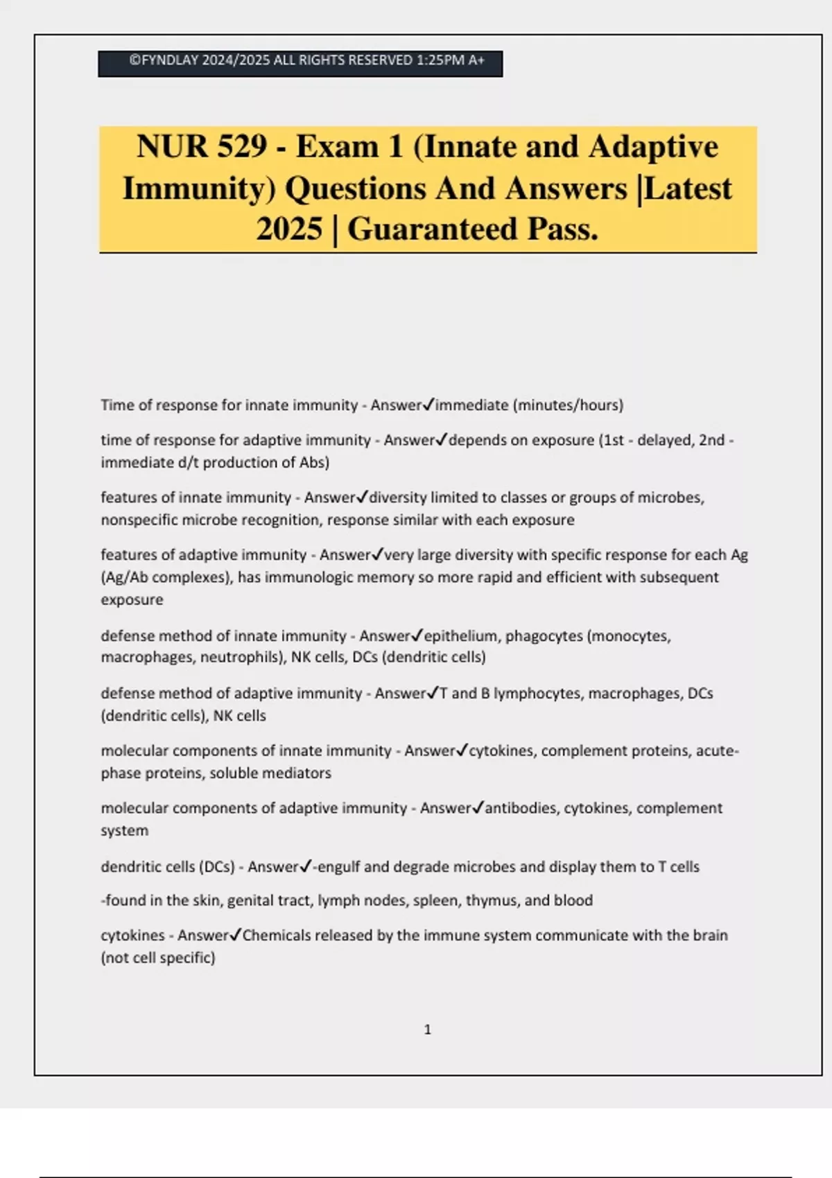 NUR 529 - Exam 1 (Innate and Adaptive Immunity) Questions And Answers |Latest 2025 | Guaranteed Pass.