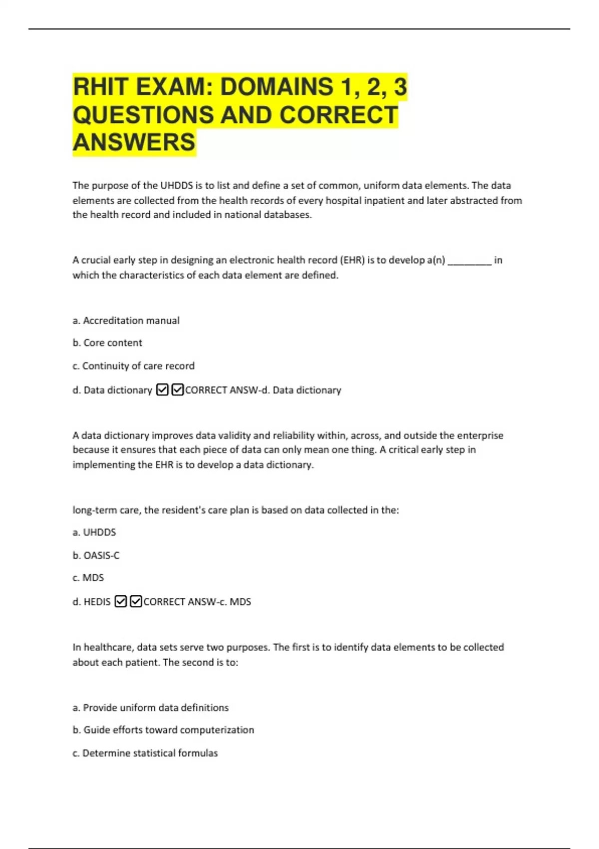 RHIT EXAM: DOMAINS 1, 2, 3 QUESTIONS AND CORRECT ANSWERS 2 Exam (elaborations) RHIT MOCK EXAMINATION (CENGAGE)150 QUESTIONS AND CORRECT ANSWERS 3 Exam (elaborations) RHIT MOCK EXAM ALL SECTIONS QUESTIONS AND CORRECT ANSWERS 4 Exam (elaborations) RHIT MOCK EXAM QUESTIONS AND CORRECT ANSWERS 5 Exam (elaborations) AHIMA RHIT PRACTICE EXAM QUESTION