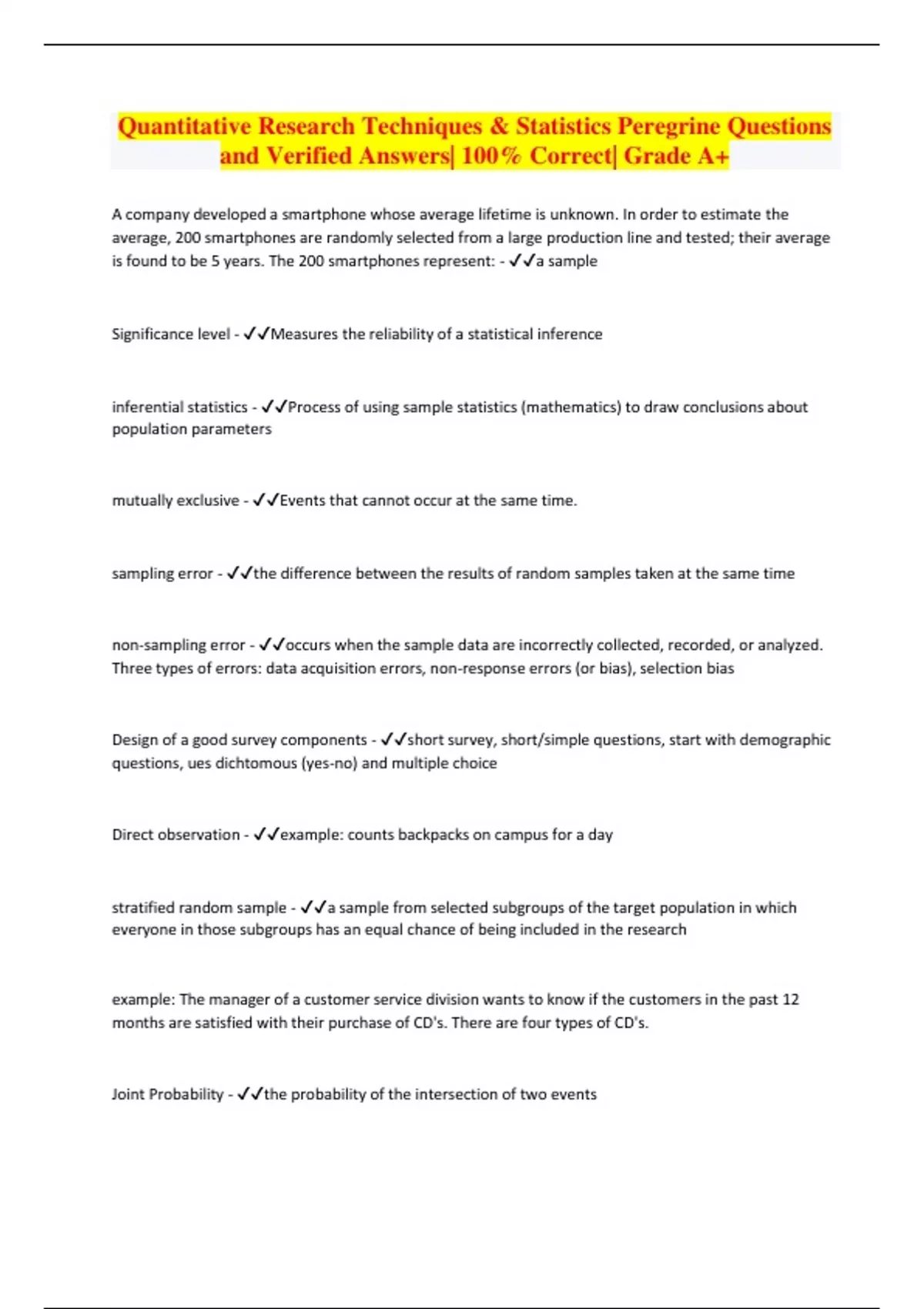 Package deal ::: Quantitative Research Exams with 100% Correct Answers