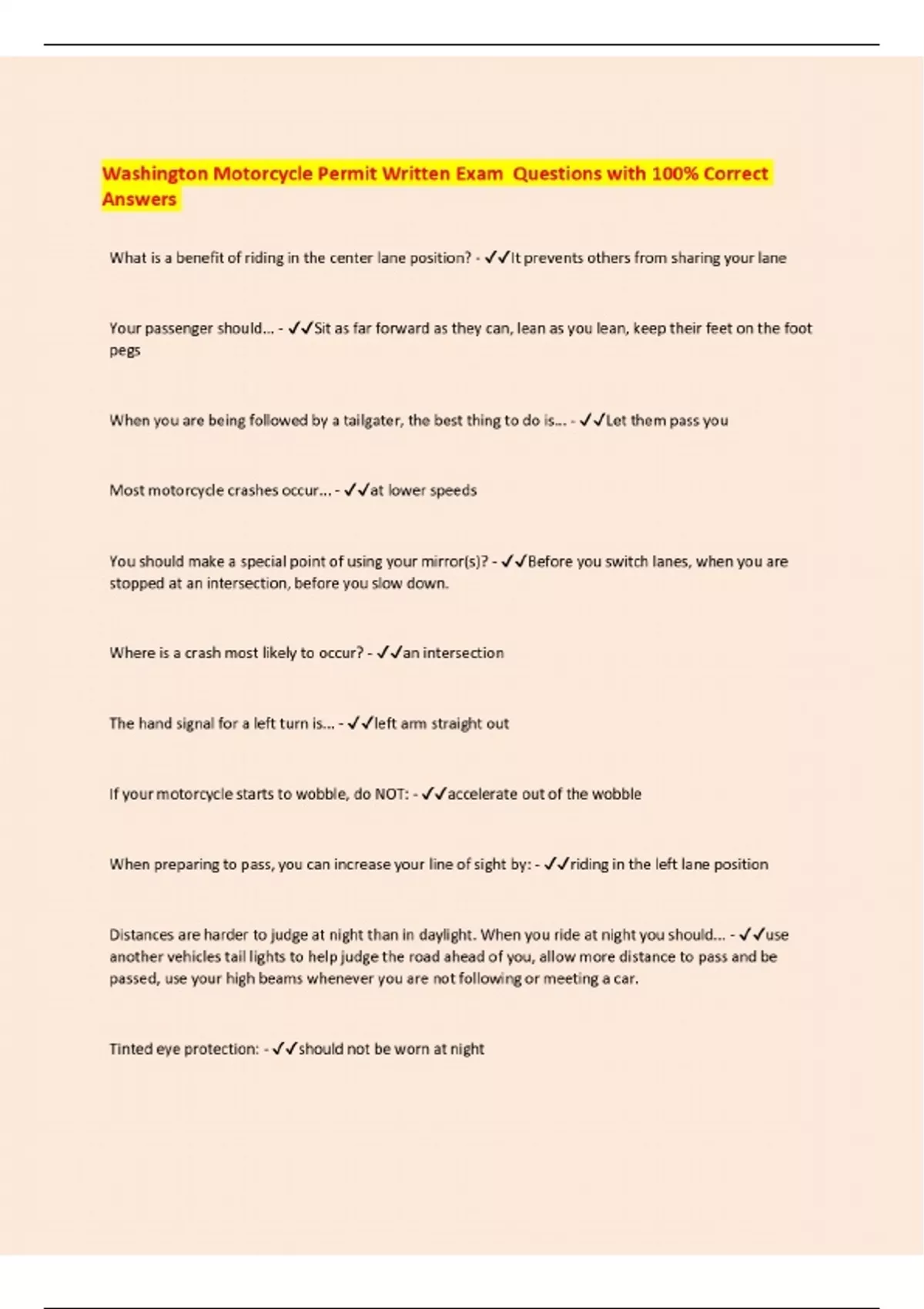 Washington Motorcycle Permit Written Exam Questions with 100% Correct Answers