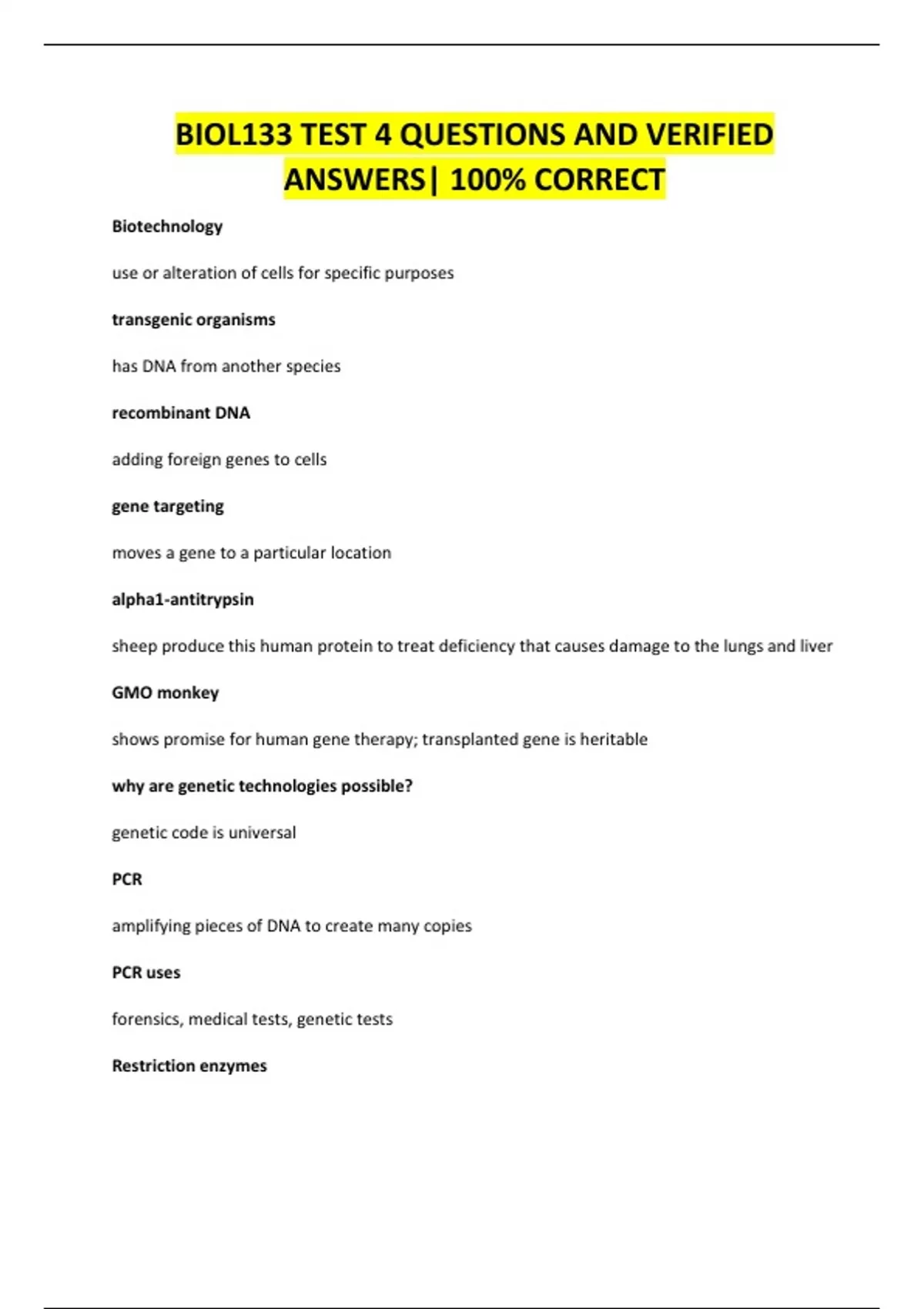BIOL133 TEST QUESTIONS AND VERIFIED ANSWERS| 100% CORRECT