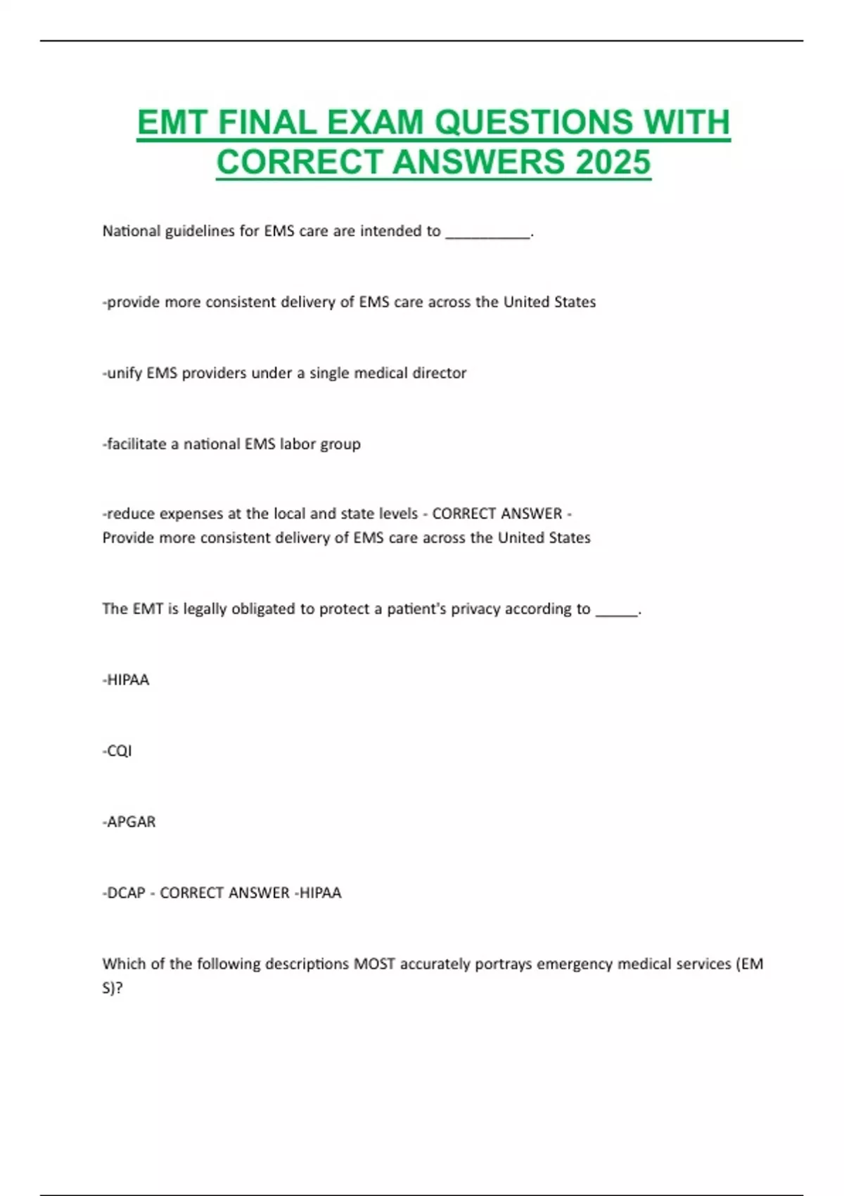 EMT FINAL EXAM QUESTIONS WITH CORRECT ANSWERS 2025